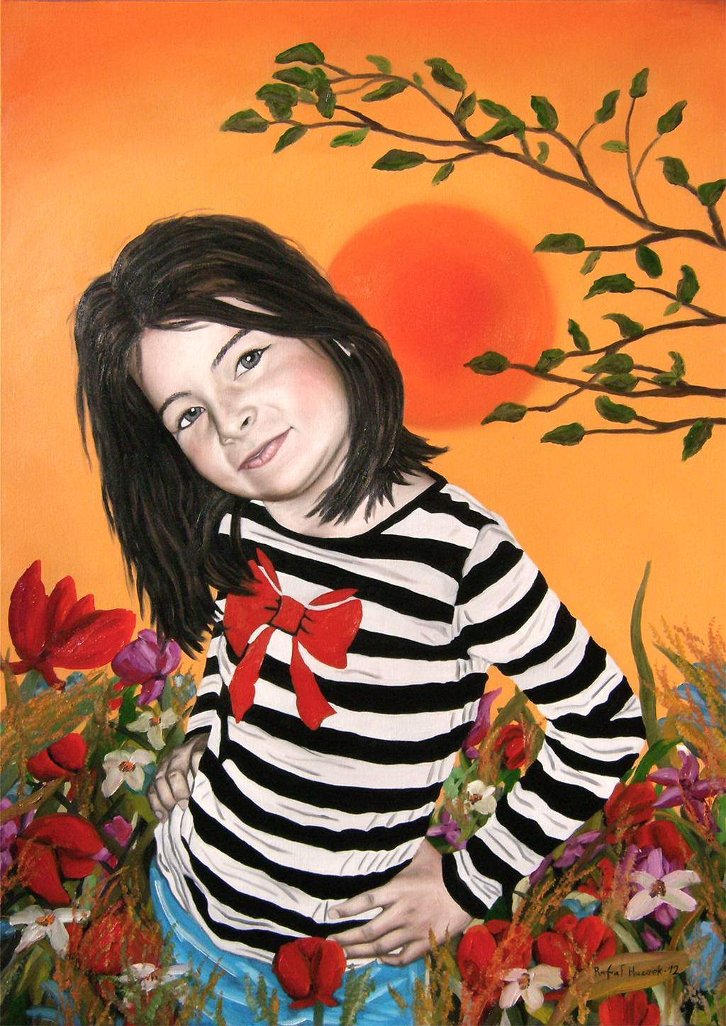 Na obrazie widzimy dziewczynkę w bajecznie kolorowej scenerii. Jej czarno-biała bluzka w paski z czerwoną kokardą kontrastuje z intensywnie pomarańczowym niebem w tle, co nadaje pracy dynamicznego wyrazu. Ciepły pomarańcz przebija się przez zieleń liści i jaskrawe czerwienie i fiolety kwiatów, tworząc energiczną, niemalże magiczną atmosferę zachodu słońca. Rozpiętość kolorów przyciąga oko i pozwala zanurzyć się w świecie dziecka pełnym marzeń i beztroski. Artystyczny styl pracy jest pełen wdzięku i naturalności. Precyzyjne pociągnięcia pędzla sugerują, że artysta starannie dopracował szczegóły, co można zauważyć w delikatnych liniach twarzy i żywych barwach kwiatów. Technika malarska jest realistyczna, ale z nutką impresjonizmu, co daje wrażenie lekkości i swobody. Obraz budzi w odbiorcy radość i nostalgię za dziecięcymi latami. Czujemy, że czas się zatrzymał, a słońce nigdy nie zniknie za horyzontem. „Słońce jak wielka pomarańcza!” – powiedziałoby dziecko z zachwytem. Dzieło jest fresh i żywotne, jak zielone liście na wietrze. Zastanawiam się, co ta dziewczynka myśli, patrząc na nas z tym nieuchwytnym uśmiechem. Cud miód, prawdziwy kawałek dzieciństwa zamknięty w ramach.