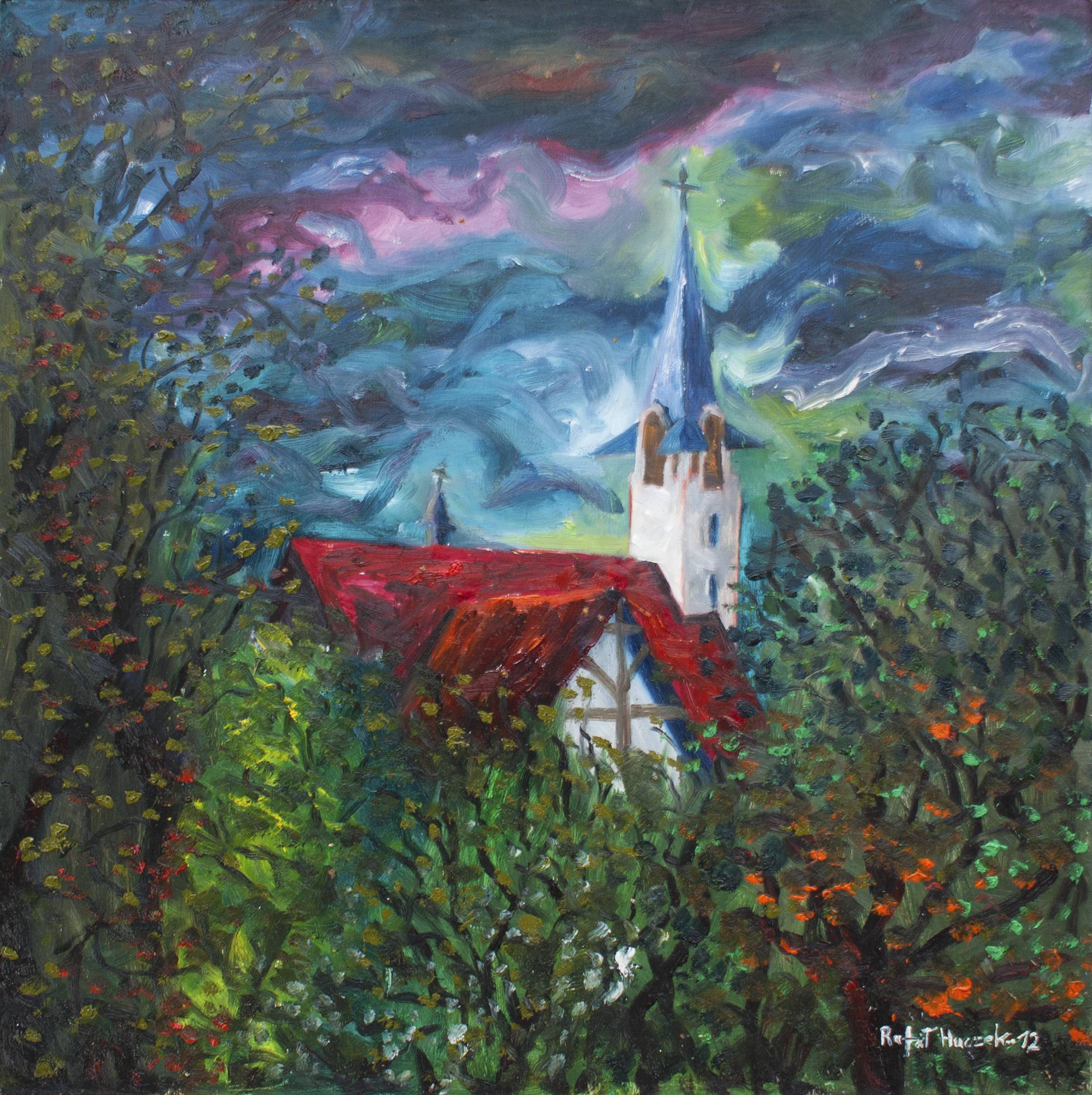 Obraz, który widzimy, emanuje dynamizmem i tajemniczością. Intensywne kolory dominują w tej kompozycji, gdzie czerwień dachu kontrastuje z ciemnym, burzowym niebem. Feeria barw, z przewagą błękitów i zieleni, tworzy nieco surrealistyczną atmosferę. Kościółek ukryty wśród drzew przypomina małą oazę spokoju. Obraz zdaje się tchnąć pewnym "stormy" nastrojem. Są tu intensywne pociągnięcia pędzla, które sprawiają, że wszystko pulsuje energią. Technika impasto, którą użył artysta, dodaje tekstury i głębi. To może wywoływać emocje od zadumy po zachwyt. Jakby malarz chciał uchwycić przedburzowy moment ciszy. Jak mawia siedmiolatek: "Chciałbym tam poskakać po kałużach!" Ten widok przypomina mi dni w dzieciństwie, kiedy burza była powodem do ekscytacji, a nie obaw. Obraz ten niemal krzyczy o nieprzewidywalności natury. Ujęty klimat sprawia, że chce się na chwilę zatrzymać i po prostu podziwiać.