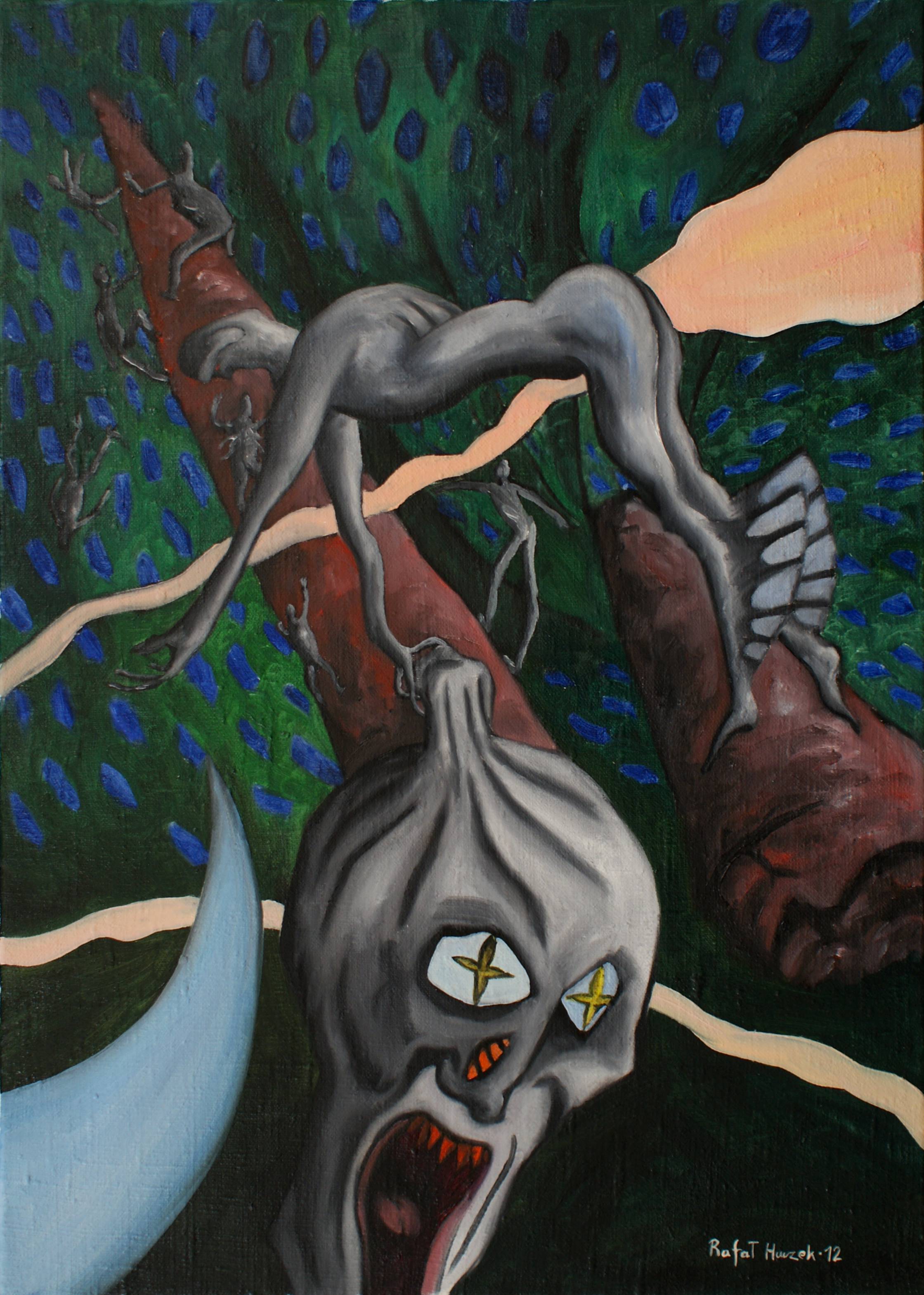 Obraz oddaje niezwykłą wizję artystyczną pełną energii i niepokoju. Dominują tu ciemne zielenie i granaty, które tworzą tajemniczą, wręcz surrealistyczną scenerię. Na pierwszym planie widać dziwną postać przypominająca fantazyjnego stwora z dużym, otwartym ustami i oczami w kształcie gwiazdek. Jego skóra jest szara, co kontrastuje z intensywnym czerwienią w tle. Cała scena jest jakby w ruchu, postacie zdają się przewracać, balansując na krawędzi. Atmosfera tego obrazu jest zdecydowanie niepokojąca, ale ma też coś z fascynującej magii. Artysta bawi się formą i kolorem, tworząc kompozycję jak z koszmaru, jednocześnie intrygując odbiorcę. Technika zastosowana tutaj to coś między ekspresjonizmem a surrealizmem, łączącym elementy figuralne z abstrakcją. Wywołuje to emocje niepewności i dziwności, które przynoszą wiele interpretacji. Dzieło krzyczy swoim "weirdness", ale jest w tym krzyku coś hipnotyzującego. Patrzę na to i czuję trochę strach, a trochę ciekawość. Ja bym się bał tego stwora w nocy! Praca przyciąga, jednocześnie przywołując wrażenie, że coś tu naprawdę jest na rzeczy. Coś tajemniczego, co chce się poznać.