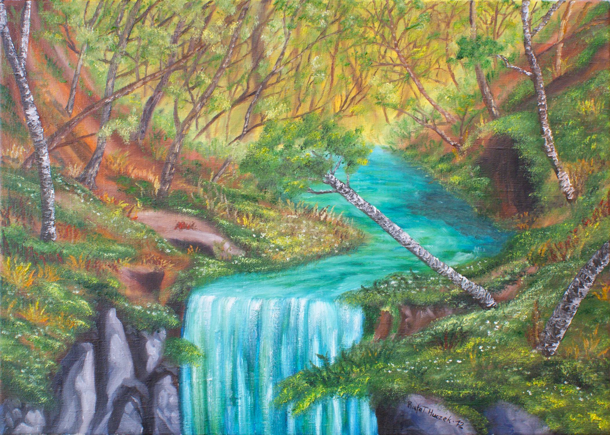 Na obrazie widzimy malowniczy pejzaż pełen energii i spokoju. Tętniące życie lasy otaczają gładką, turkusową rzeczkę, która delikatnie przepływa przez krajobraz. Woda błyszczy niczym ocean w letni dzień, a promienie słońca przemykają przez zielone liście drzew, tworząc magiczną poświatę. To miejsce wygląda jak z bajki! Malowane szerokimi pociągnięciami pędzla, drzewa wydają się tańczyć na wietrze. Kompozycja obrazu jest harmonijna. W lewym dolnym rogu ukazuje się wodospad, dodając dynamiki i ruchu całemu dziełu. Przyroda stapia się w swej naturalnej palecie barw: zieleni, brązów i błękitów. Artysta zastosował technikę impasto, co pozwoliło na nadanie faktury drzewom i wodzie. Ten obraz emanuje spokojem i zachęca do refleksji. Osoba patrząca na niego może poczuć wewnętrzny spokój i rozmarzyć się o cichym spacerze brzegiem rzeki. Ta sceneria przypomina mi wakacje u dziadków, pełne beztroski i odkrywania nowych miejsc. W skrócie, jest to magiczny world, który wciąga odbiorcę kompletnie w swój zmysłowy urok.