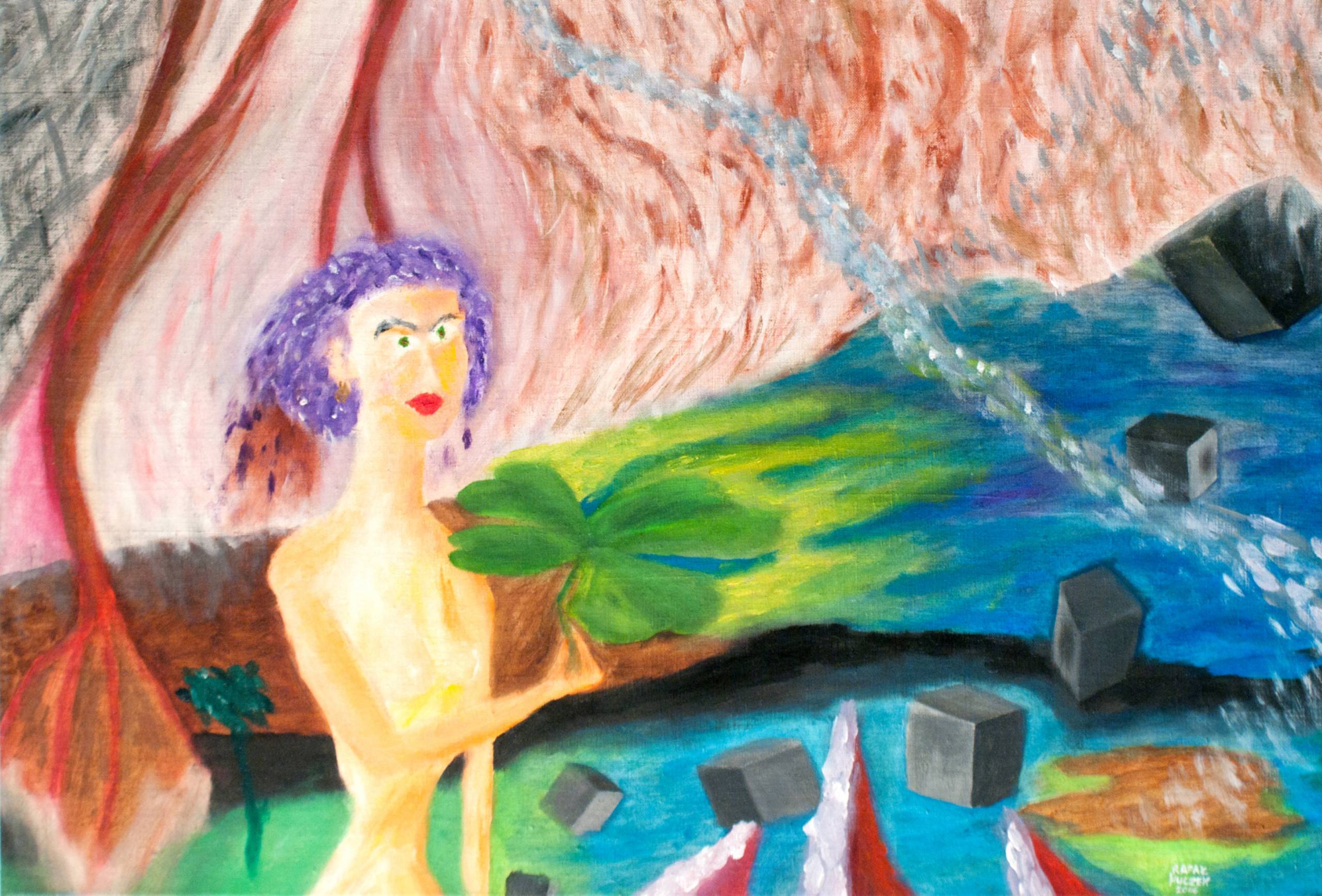 Na obrazie dominuje plejada intensywnych kolorów, od fioletowego, przez zielenie, aż po intensywne błękity i czerwienie. Centralną postacią jest enigmatyczna postać z fioletowymi włosami trzymająca zielony liść, jakby próbowała ukryć coś niewidocznego. To przypomina mi magiczny świat z bajki! Tło obrazu to dynamiczna mieszanka falujących form i kształtów, które przechodzą płynnie z jednej części obrazu do drugiej. Atmosfera jest trochę surrealistyczna, jakby wyjęta z fantastycznego snu albo baśni. Artysta użył spontanicznych pociągnięć pędzla, co nadaje całości nieco niedbałego, lecz celowo ekspresyjnego stylu. Kolory sprawiają, że czuję się jak w środku tętniącego życiem krajobrazu. Elementy takie jak sześcienne kształty wydają się unosić w przestrzeni, przez co całość wręcz pulsuje energią. Obraz może wywoływać u widza mieszane emocje — od zdumienia po lekki niepokój. Zaniedbywanie detali sprawia, że dzieło wydaje się być pełne life, a jednocześnie niedopowiedziane. To jak wycinek z dziwacznego snu, który nie daje o sobie zapomnieć.