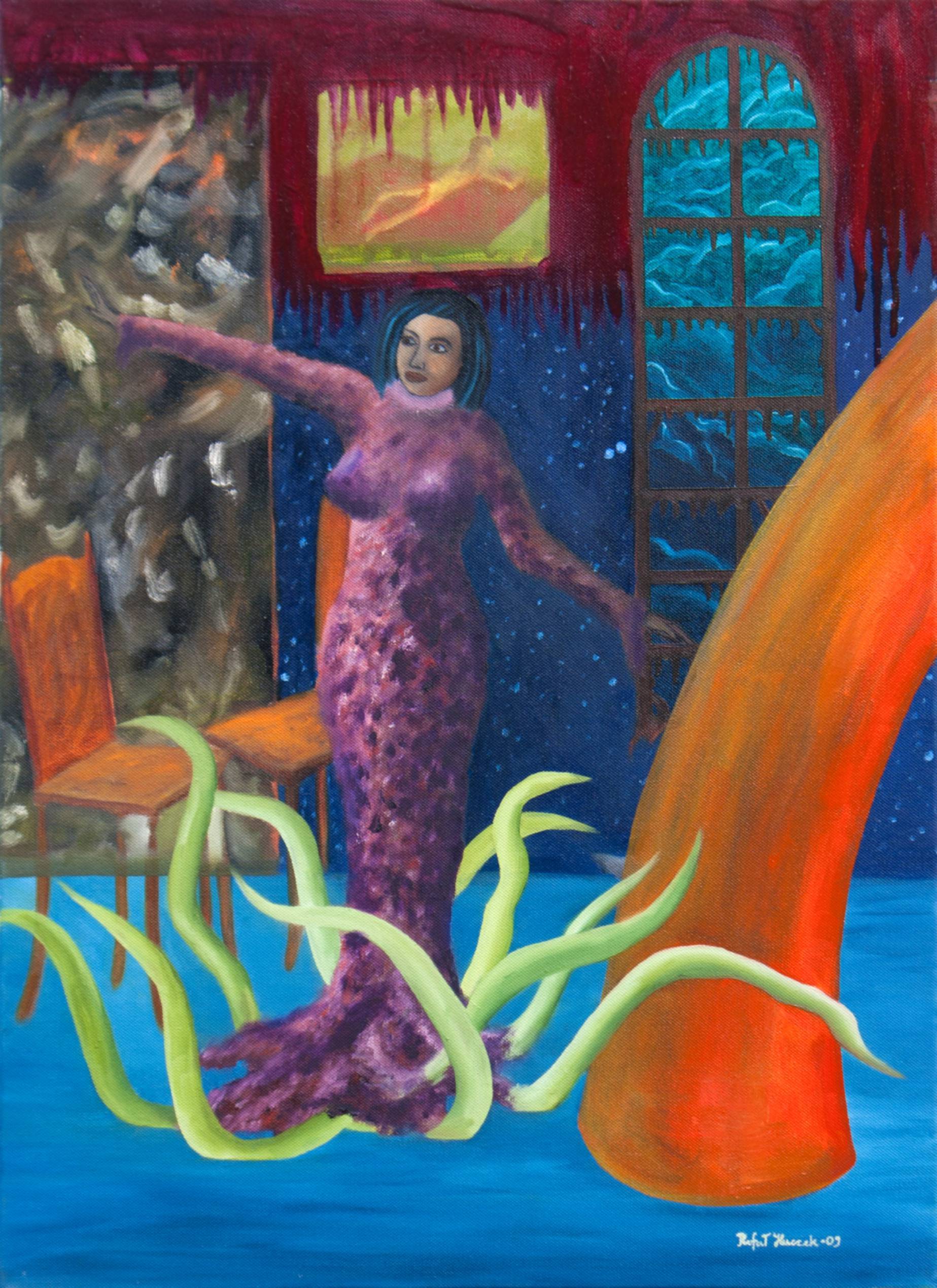 Obraz emanuje tajemniczością, mieszając intensywne barwy i surrealistyczne kształty. Centralną postać otacza fioletowa suknia, z której wyrastają wijące się, zielone formy wyglądające jak macki. Ściany tła pokrywają głęboki granat i morskie tonacje, a okno po prawej ukazuje burzliwe morze. Czerwień kapie z góry, dodając dramatyzmu i dreszczyku emocji. Atmosfera wydaje się jak z dziwnego snu, pełna zagadkowej dynamiki. Czujesz się jakbyś był gdzieś pomiędzy rzeczywistością a wyobraźnią. Techniki malarskie są odważne, z wyraźnymi pociągnięciami pędzla, tworzącymi nieco chaotyczną, ale fascynującą kompozycję. Można poczuć niepokój i zdziwienie. Ktoś może się zastanawiać, co ta scena naprawdę oznacza. Może to symbolika walki z niewidzialnymi siłami, które nas krępują? A może po prostu eksploracja wolności wyobraźni? Patrząc na to, myślę sobie: "Wow, to jak scena z jakiegoś magicznego świata, pełna nieoczekiwanych zwrotów". This painting really captures the imagination... Dla dziecka może być po prostu "dziewczyną z dziwnymi roślinami". Obraz to prawdziwa podróż przez emocje.