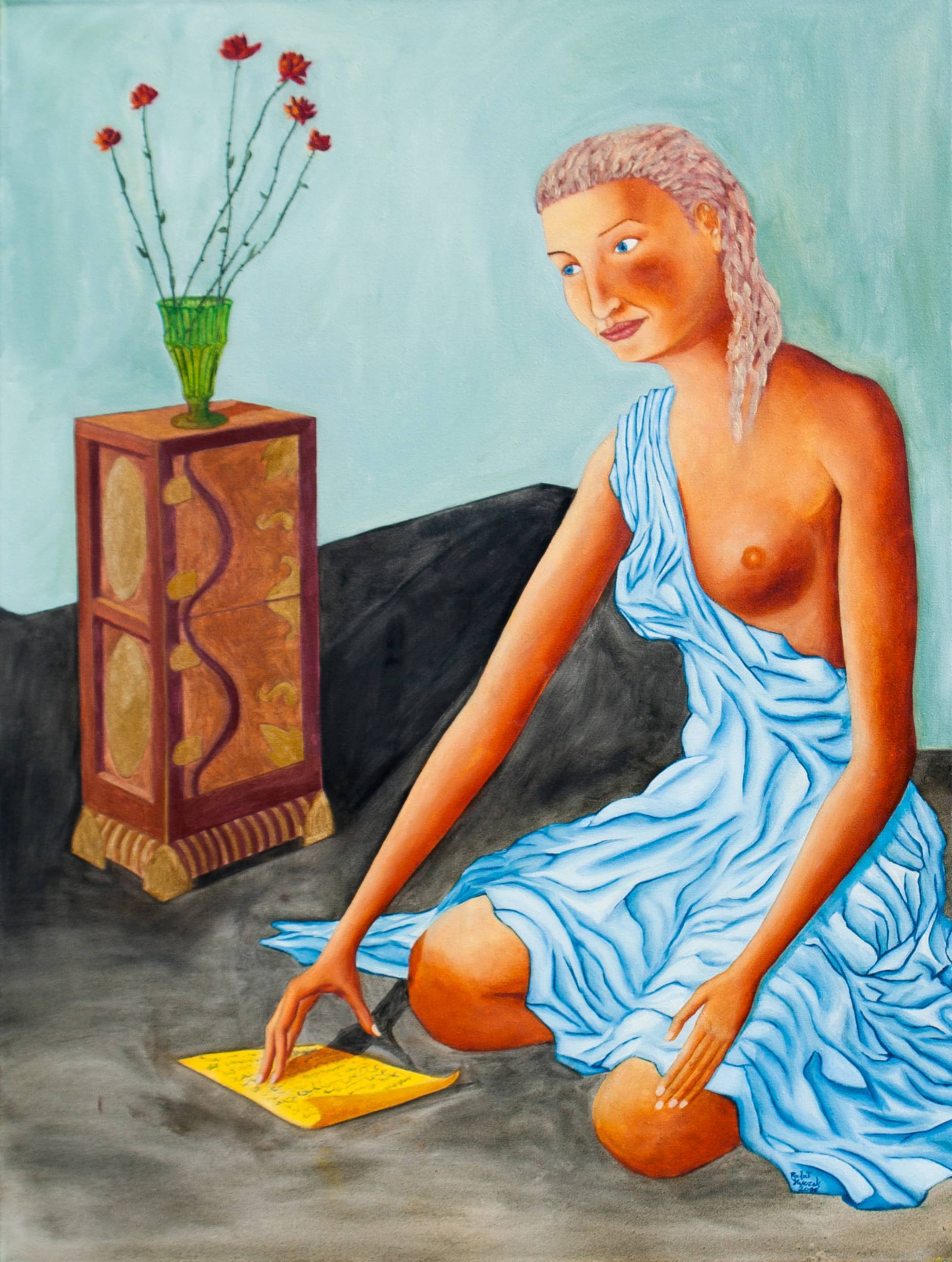Na obrazie widać kobietę w niebieskiej, drapowanej sukni, siedzącą na szarej podłodze. Jej jasne, niemal białe włosy kontrastują z ciepłym odcieniem skóry. Twarz kobiety jest spokojna, pełna subtelnego uśmiechu. Czy ona myśli o czymś miłym? Obok niej stoi niski stolik, a na nim zielony wazon z kilkoma czerwonymi kwiatami. Kolory są stonowane, ale jednocześnie żywe – zieleń wazonu szczególnie przykuwa uwagę, a kwiaty dodają koloru całej kompozycji. Nieco abstrakcyjny styl oraz łagodne linie i pastelowe odcienie sprawiają, że dzieło emanuje spokojem. Artysta używa technik mieszanych, tworząc teksturę, która wydaje się niemal dotykalna. Emocje płynące z obrazu mogą budzić refleksję nad ulotnością chwili. Co ta kobieta czyta? Może to love letter, pełen nieodkrytych uczuć i historii. Dzieło wciąga w świat ciszy i spokoju, prowadząc do osobistych przemyśleń. Patrząc na obraz, można poczuć, jak czas zwalnia, a myśli unoszą się lekko. To jak chwila zatrzymana w ramy.