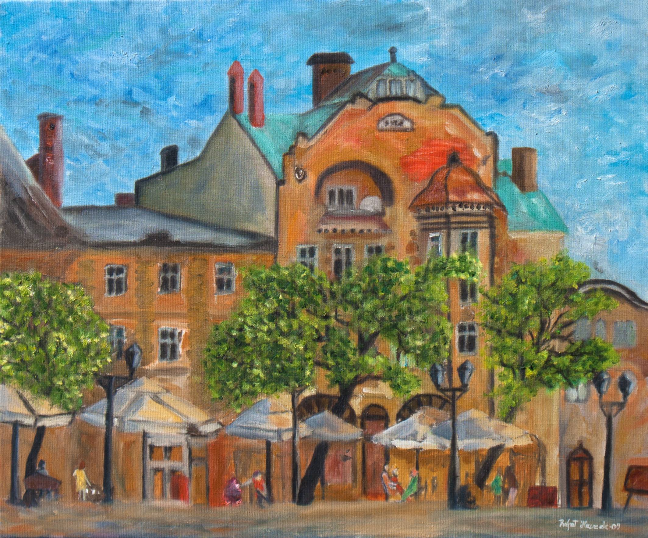 Ten obraz to prawdziwa feeria barw i kształtów. Dominują ciepłe odcienie brązu i pomarańczu, które kontrastują z soczystą zielenią drzew. Budynki w tle są masywne, z bogato zdobionymi fasadami i fantazyjnymi dachówkami. Nad wszystkim rozpościera się niebo w nasyconym błękicie, usiane delikatnymi obłokami. Kompozycja jest dynamiczna, kropki drzew wprowadzają rytm i harmonię. Na pierwszy rzut oka czuć spokój, choć artysta nie boi sie dodać troszkę bałaganu. Obraz emanuje pogodnym nastrojem typowym dla wiosennego dnia w małym miasteczku. Styl artystyczny jest lekko impresjonistyczny, z wyraźnymi pociągnięciami pędzla. Technika ta dodaje dziełu życia, sprawia, że niemal czuje się lekki powiew wiatru. Patrząc na ten obraz, można poczuć chęć do ucieczki od codzienności i przeniesienia się w spokojne miejsce. Dzieło wzbudza uśmiech i nostalgiczne wspomnienia z wakacji. Budzi we mnie odrobinę tęsknoty za beztroskimi dniami. Myślę sobie: "To idealne miejsce na popołudniową kawę." A little piece of heaven! Na obraz patrzy się jak na kartkę z książki o miasteczku żyjącym własnym rytmem, a cały ten pejzaż mówi: "hej, zatrzymaj się, spójrz i ciesz się chwilą."