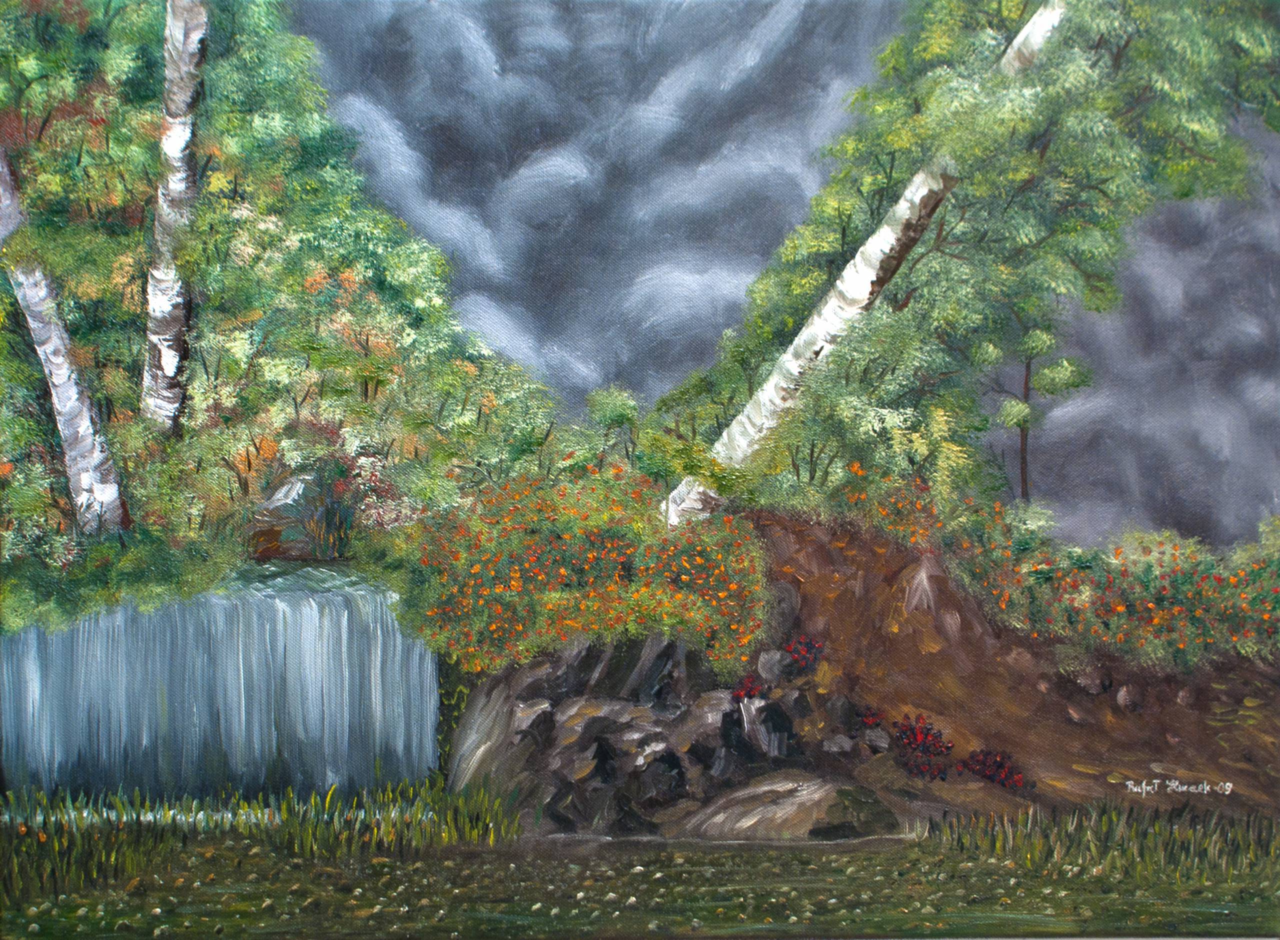 Na obrazie widzimy malowniczy krajobraz, w którym dominują zieleń i szarość. Bujne drzewa z białymi pniami kontrastują z ciemnym niebem pełnym burzowych chmur. Artysta zastosował dynamiczne pociągnięcia pędzla, dzięki czemu całość wydaje się być w ruchu. W tle słychać szum wodospadu, co dodaje dramatyzmu. Polana z kolorowymi kwiatami ożywia kompozycję, przyciągając wzrok swoją intensywnością. Feeria barw sprawia, że czuć wiosenną świeżość. I te drzewa są takie fajne! Atmosfera obrazu jest pełna napięcia, z jednej strony sielskość natury, z drugiej niepokój nadchodzącej burzy. Styl przypomina impresjonizm ze względu na technikę punktowania i mieszanie barw. Obraz może wywoływać w odbiorcy poczucie spokoju, ale też oczekiwania na coś nieprzewidywalnego - jak w życiu. Wow, amazing! Artysta bawi się światłem, tworząc grę cieni, co dodaje tajemniczości. Każdy element ma swoje miejsce, a jednak wszystko ze sobą współgra, jak w harmonijnej symfonii. Wydaje się, że przyroda żyje własnym życiem, nie zważając na nasze emocje i problemy. Dzieło prowokuje do refleksji nad siłą natury i jej nieprzewidywalnością.
