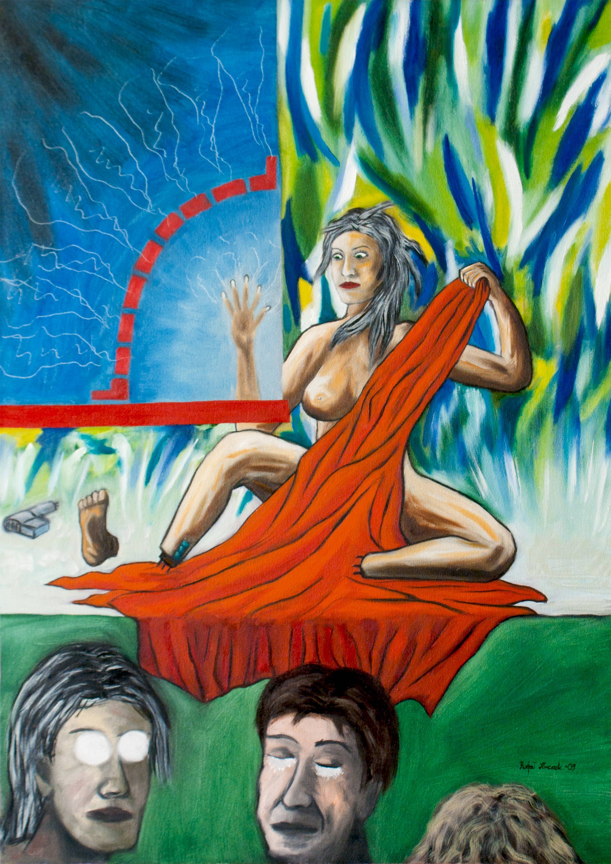 Obraz emanuje energią, łącząc kontrastujące kolory: głównie chłodne błękity i zieleni, połączone z intensywnym czerwonym kocem, który zdaje się niemalże falować przed oczami. Postać w centrum obrazu przyciąga wzrok swoją surową obecnością, jej srebrne włosy i wyraz twarzy pełen determinacji sprawiają, że wszystko wokół zdaje się zastygać. Dłoń unosi się w geście, jakby chciała chwycić coś niewidzialnego, może intencje lub marzenia. w tle abstrakcyjne smugi farby budują napięcie. Atmosfera obrazu jest jednocześnie napięta i enigmatyczna, trudna do jednoznacznego zdefiniowania. Styl artystyczny jest dynamiczny, a zastosowane techniki malarskie wskazują na swobodny i emocjonalny sposób wyrazu, być może inspirowany ekspresjonizmem. Elementy surrealizmu dodają całości nieco tajemniczości, zarazem wodząc odbiorcę na manowce własnych myśli i refleksji. Przy pierwszym spojrzeniu można poczuć coś jak zaskoczenie (wow!), ale po dłuższej chwili refleksji przychodzi zrozumienie, że to opowieść o odkrywaniu siebie. Wyobrażam sobie, że takie dzieło mógłby podsumować siedmiolatek mówiąc: "To jak sen, który mama ma czasem". Osobiście czuję, że jest tu coś ukrytego. Może jak echo naszych podświadomych pragnień, które czasem boimy się przyznać. Układ kompozycyjny jest nieoczywisty, co czyni dzieło oryginalnym i interesującym. Coś w tym obrazie przypomina "magic" chaosu codzienności w sposób fascynujący i trochę przerażający. To jak szukanie sensu w rzeczywistości pełnej symboli. Obraz nie pozwala o sobie zapomnieć.