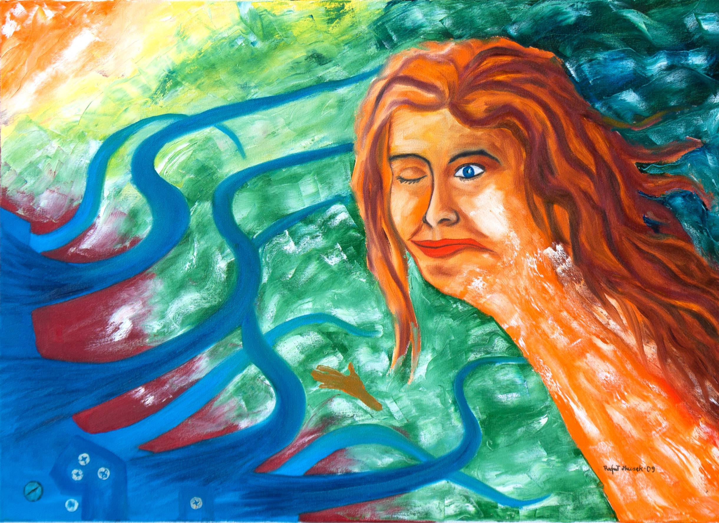 Patrząc na ten obraz, pierwsze co rzuca się w oczy to intensywne kolory. Zielony, niebieski i pomarańczowy tworzą dynamiczną mieszankę barw, które jakby tańczą na płótnie. Na środku widzimy niezwykłą twarz, z jednym okiem zamkniętym, a drugim wyłupiastym, co daje trochę surrealistyczny feeling. Twarz otoczona jest przez kręte, niebieskie linie, które przypominają wijące się rzeki lub węże. Światło rozproszone jest jakby przez mgiełkę, a delikatne, lecz ekspresyjne pociągnięcia pędzla nadają obrazowi wyjątkowego ruchu. Artysta sięgnął po techniki impresjonistyczne, choć można dostrzec wpływy surrealizmu, zwłaszcza w nierealistycznych proporcjach i płynnych kształtach. Może wywołać u widza rozmaite emocje: od zaskoczenia po fascynację—czy to nie jest niesamowite? Dla kogoś może to być obraz zabawny, dla kogoś innego może być nieco creepy. Jak mówi babcia, każdy widzi to, co chce widzieć. Na chwilę chciałoby się być jak to dziecko i wykrzyknąć: "Ona ma oczy jak wielkie kulki!" To jest właśnie to, co czyni sztukę unikalną—interpretacja jest absolutnie wolna. Ten obraz to jak jazda bez trzymanki przez kolorowy rollercoaster. Keep your mind open, a może dostrzeżesz coś, co Cię pozytywnie zaskoczy. W końcu warto się czasem zatracić w kolorowym chaosie, prawda?