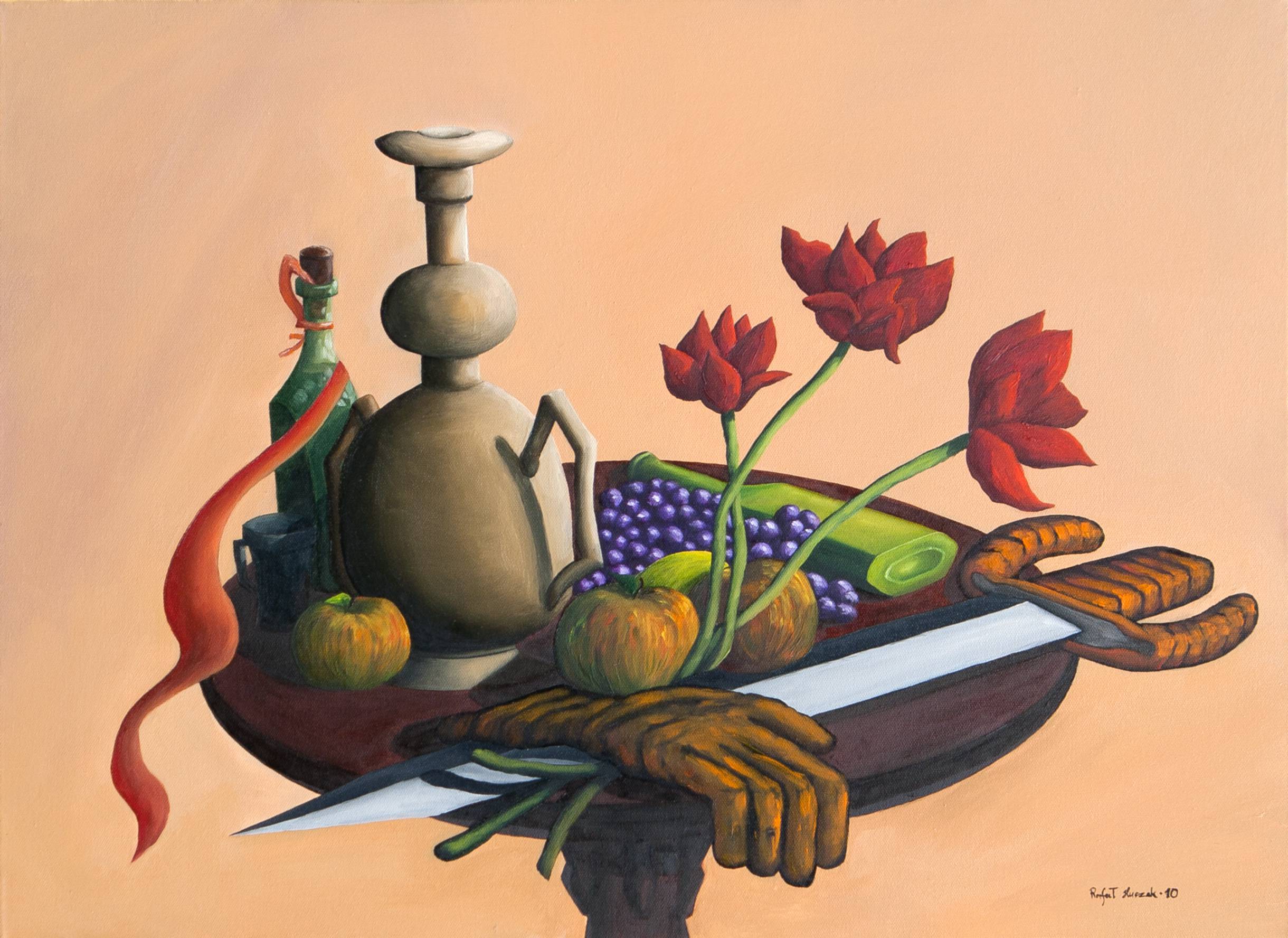 Ten obraz to istna uczta dla oczu. Zestawienie kolorów jest subtelne, dominuje ciepły beż, a na jego tle wyróżniają się głębokie czerwienie kwiatów i intensywność fioletowych winogron. W centrum znajduje się okazały wazon, trochę jak z muzeum, obok którego leży spoczywająca rękawica i miecz. Wow, miecz! Kompozycja jest elegancka, trochę jak ze starego obrazu w stylu martwej natury. Atmosfera jest jednocześnie spokojna i tajemnicza, jakby coś się miało wydarzyć. To przez te przeciwstawne elementy: delikatne kwiaty obok groźnego miecza. Styl artystyczny wydaje się klasyczny, ale z twistem. Może to przez sposób, w jaki artysta wykorzystał technikę światłocienia, by nadać obiektom trójwymiarowość. Obraz wywołuje emocje niepewności (co tu robi ten miecz?) i zadumy nad przemijaniem czasu. Może to symbol walki pomiędzy pięknem a siłą? A może to tylko zwykłe codzienne przedmioty na stole. It’s up to you. Myśli biją się na temat tego, co autor chciał przekazać. Maluch powiedziałby "czy miecz się potrafi bawić kwiatkami?". To sztuka, która zmusza do myślenia, do odkrywania swojej interpretacji.