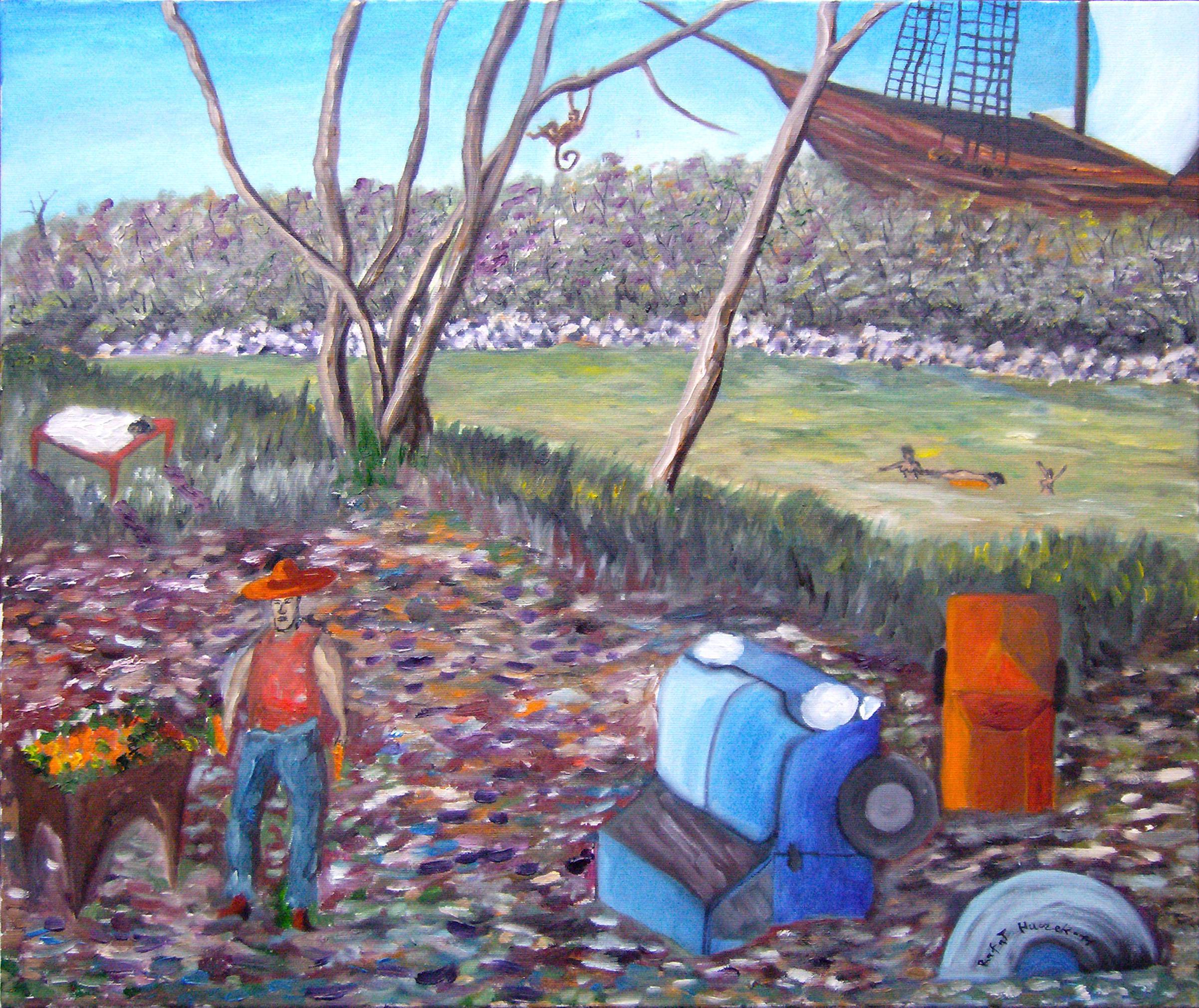 Na obrazie dominują barwy natury – soczysta zieleń trawy i delikatne błękity nieba. Centralnie widzimy mężczyznę w czerwonym kapeluszu, który przypomina trochę kowboja, tylko że zamiast na koniu, stoi obok drewnianej taczki z kwiatami. Kompozycja jest dynamiczna, z drzewami pnącymi się w górę niczym gałęzie, które chcą dotknąć nieba. O co tutaj chodzi? Atmosfera jest swojska, ale jednocześnie nieco tajemnicza, jakby coś się miało wydarzyć. Może to przez ten statek wiszący w powietrzu, a może przez szopkę z boku. Obraz emanuje spokojem, ale i nutką absurdu. Wow, look at this! Wydaje się, że artysta bawi się perspektywą i kolorami, co tworzy surrealistyczny klimat. Można poczuć się jak w sennym marzeniu. Technika olejna nadaje dziełu głębokość. Dziecko mogłoby powiedzieć: „Patrz, statek wisi jak balonik!”. Emocje są mieszane: od zaskoczenia po zachwyt. To obraz, który każe się zatrzymać i pomyśleć.