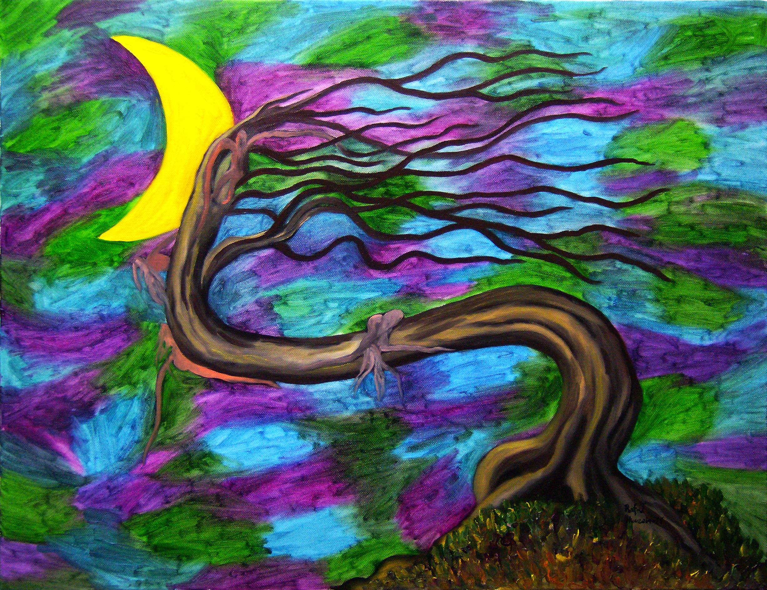 Obraz wesoło gra kolorami, tworząc dynamiczną kompozycję. Tło to intensywna mozaika zieleni, błękitów i fioletów, w której dominują płynne, rozmazane kształty. Na ich tle wyróżnia się melancholijnie wygięte drzewo, które zdaje się tańczyć w blasku jaskrawego, żółtego księżyca. Jego gałęzie, niczym palce pianisty, wyciągają się ku niebu, komponując zawiły wzór. Artyściak postawił na ekspresyjność. Miesza techniki, używając grubych pociągnięć pędzlem oraz harmonijnych przejść kolorów. To jest trochę jak wild ride przez emocje natury. Atmosfera obrazu jest pełna jakiejś magicznej tajemniczości, jakby zapraszała nas do świata, gdzie wszystko jest możliwe, a drzewo może szeptać sekrety wiatru. Odbiorca może poczuć nostalgię oraz lekkie poczucie niesamowitości, jakby wspomnienia z dzieciństwa ożyły na chwilę. Wow, patrzcie, drzewo mówi do księżyca! Obraz może też budzić refleksję nad nieustającym cyklem przyrody i naszej więzi z nią. Personalnie, obraz ten skłania mnie do zastanawiania się nad ulotnością chwil i pięknem nocnego nieba, które czasem umyka w naszym zabieganym daily life.