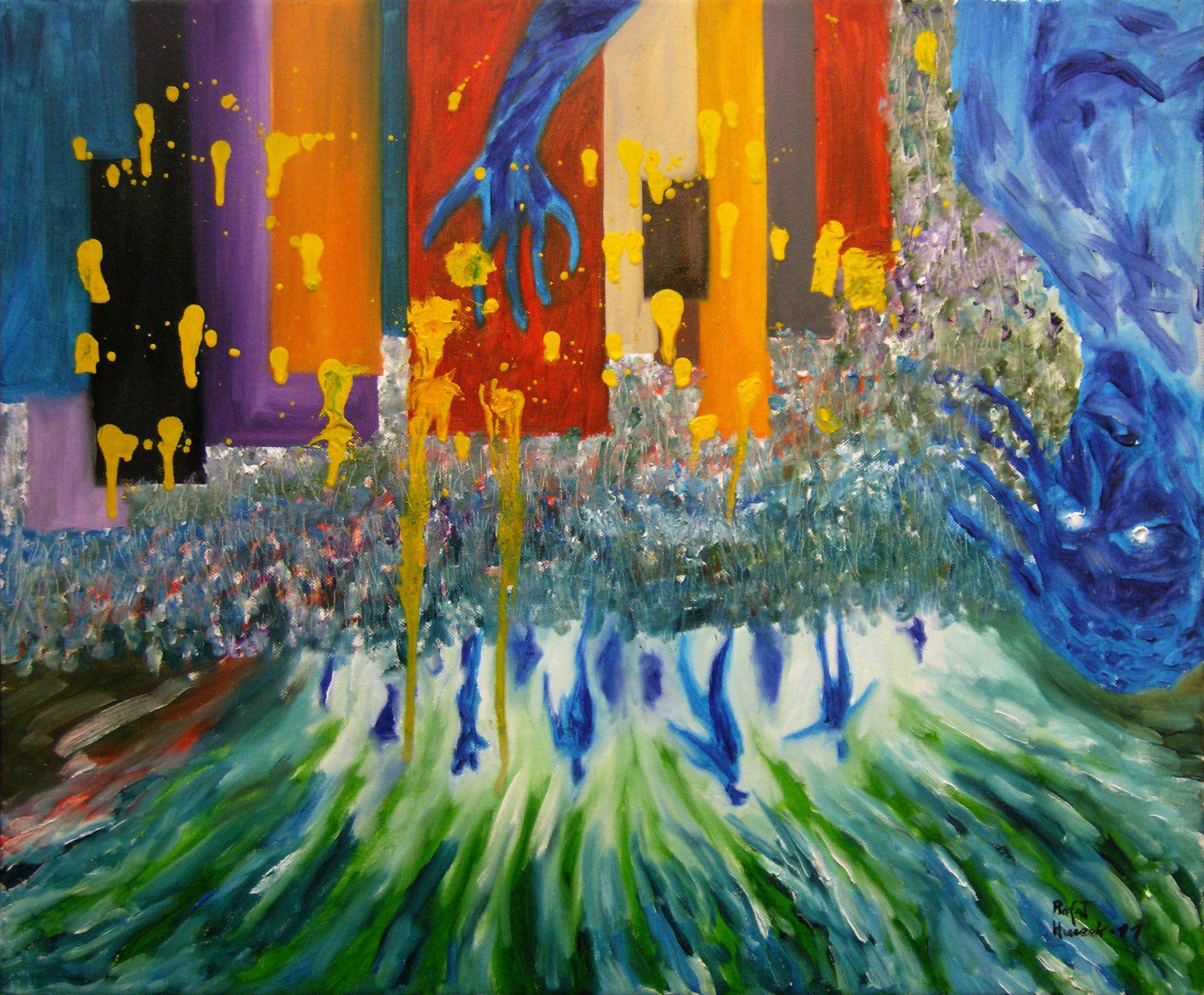 Obraz pełen jest intensywnych kolorów. Na pierwszy rzut oka widać feerię barw: od głębokiego błękitu, przez jaskrawą żółć, po mocny fioletowy. W centrum znajduje się błękitna dłoń, która jakby tonęła w chaotycznej symfonii pionowych pasów. Każdy z nich ma swój własny, unikalny kolor, i to jakby okna do innego świata. Kleksy żółtej farby unoszą się na powierzchni, dodając dziełu dynamiki i energii. Atmosfera obrazu jest jednocześnie żywa i nieco zagadkowa. Technika artysty wydaje się być na pograniczu abstrakcji i surrealizmu, co sprawia, że widz czuje się jak w świecie snów. To jest mieszanka dream i rzeczywistości, formy przenikają się nawzajem, tworząc niesamowitą wizualną opowieść. Czuć tutaj ekspresję emocji, artysta pewnie dał z siebie wszystko. Dla mnie, ten obraz to jak tajemnicza podróż przez krainę wyobraźni. Odbiorca może zastanawiać się, co oznacza ta niebieska dłoń? Czy to zaproszenie do czegoś więcej, czy może symbol nieosiągalnych marzeń? Mały chłopiec mógłby powiedzieć „Ale to jest dziwne i fajne!” i miałby rację. Może to chaotyczne, może nieco zaskakujące, ale na pewno nie pozostawia obojętnym. Dlaczego to czuję? Bo obraz pulsuje życiem, jakby miał własne serce.