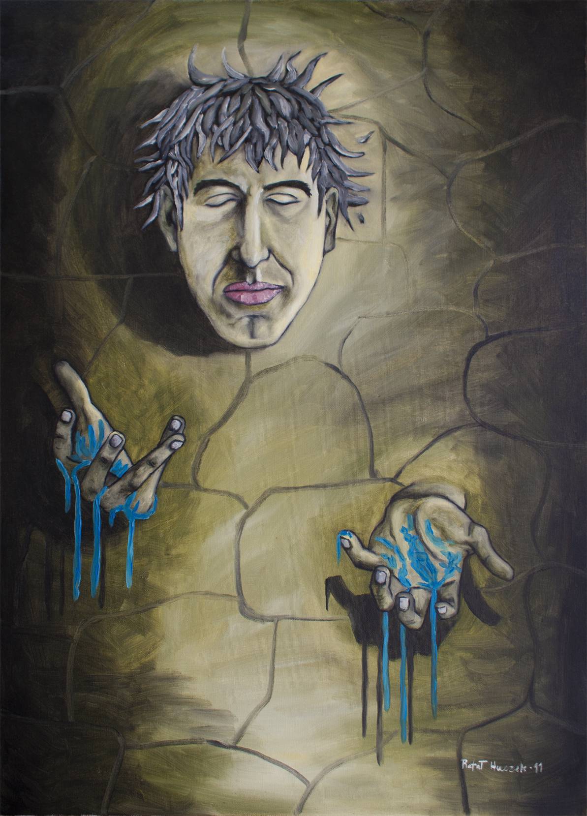 Obraz przedstawia surrealistyczną wizję twarzy i rąk wyłaniających się z kamiennej ściany. Dominują tu odcienie szarości i zgniłej zieleni, które tworzą tajemniczy i niepokojący nastrój. Wyraz twarzy jest zamyślony, z zamkniętymi oczami i delikatnie zaciśniętymi ustami. Ręce, wyciągnięte w stronę widza, są pokryte niebieskimi, niemal fluorescencyjnymi strużkami, które przypominają płynącą farbę. Wow, wygląda jakby zaczarowane! Kompozycja jest centralna, podkreślając wyrazistość i intensywność spojrzenia na postać, która wydaje się być jednym z elementów muru. To tak, jakby artysta chciał połączyć człowieka z otoczeniem, pokazując kruchość i jednoczesną trwałość ludzkiej egzystencji. Coś jak puzzle życia. Styl przypomina nieco dzieła ekspresjonistów, z wyraźnym naciskiem na emocje i odrealnienie. Techniki użyte przez artystę pozwalają na efektowną grę światła i cienia, a kontrastujące kolory przyciągają uwagę, dając poczucie niepokoju. Mówiąc po prostu, "zapiera dech w piersiach". To dzieło, które może wywoływać wielość interpretacji, od więzi emocjonalnych aż po egzystencjalną refleksję na temat życia. Mnie osobiście przypomina o ulotności chwili i o tym, jak łatwo można zatracić się w rutynie dnia codziennego. Ten obraz to takie life-changing moment dla oka i duszy.