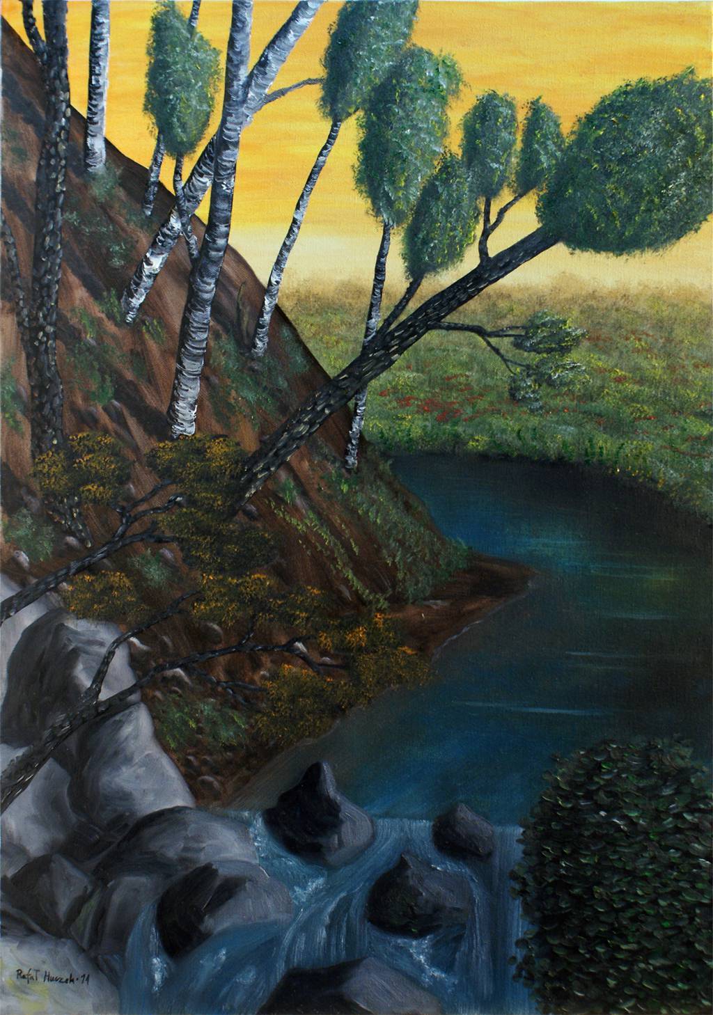Obraz ukazuje malowniczy krajobraz, gdzie barwy mieszają się w harmonię natury. Na pierwszym planie widzimy smukłe brzozy, ich białe pnie wyraźnie kontrastują z soczystą zielenią liści. Drzewa te, stojące na stromej skarpie, przyciągają wzrok swoją elegancją. Coś w tym jest - jak bajka! Tło obrazu mieni się odcieniami żółci i pomarańczy, wskazując, że to prawdopodobnie zachód słońca. Spuszczający się ze skał strumień wprowadza dynamiczny element, a jego krystaliczna woda wiruje wokół ciemnych kamieni. Nastrój przedstawienia jest pełen spokoju, z nutą nostalgii. Artysta zastosował technikę olejną, a pociągnięcia pędzla dodają obrazowi tekstury. Detale, takie jak delikatne refleksy świetlne na wodzie, są godne podziwu i dodają dziełu realistycznego wymiaru. Patrząc, czujemy się jakbyśmy stali na brzegu tej rzeki, wsłuchując się w szmer wody. Emocjonalnie obraz może przywoływać uczucie odprężenia i tęsknoty za naturą. Przynosi na myśl wspomnienia ciepłych wieczorów spędzonych na łonie natury. One more thing, there's magic in those colors! To prawdziwa uczta dla oczu, zachwycająca zarówno kolorystyką, jak i finezyjnymi detalami.