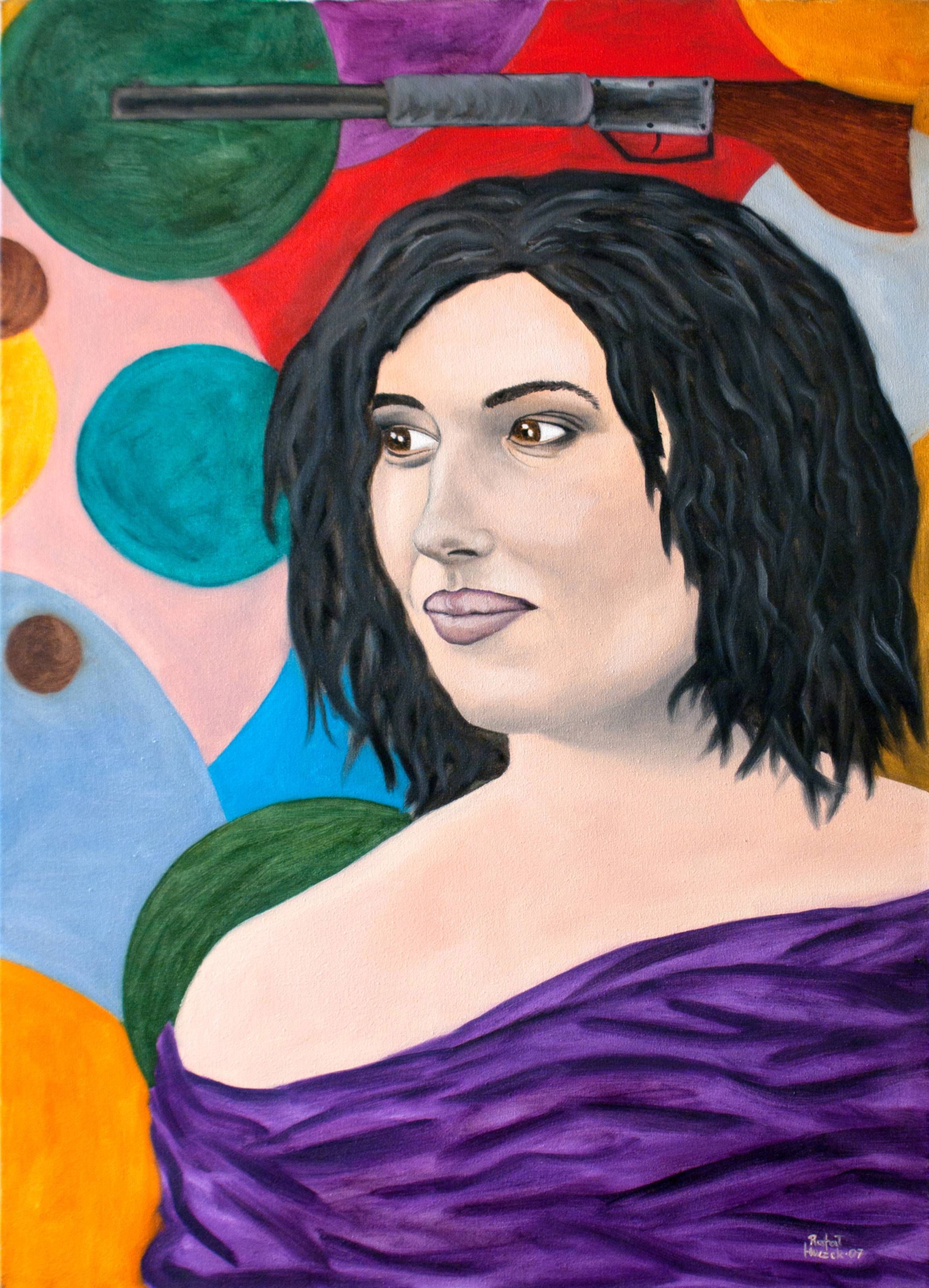 Na obrazie widzimy portret kobiety o ciemnych, falujących włosach, która patrzy w dal z zamyślonym wyrazem twarzy. Tło to eksplozja kolorów - zielenie, czerwienie, żółcie i błękity rozlewają się w formach geometrycznych, przypominając niebo wypełnione kolorowymi balonami. Jest też coś zaskakującego - broń majacząca w górnej części obrazu, co dodaje niepokojącego elementu. Jej fioletowa suknia kontrastuje z resztą palety barw, przyciągając wzrok. Styl przypomina nieco surrealistyczne malarstwo, gdzie nierealne elementy łączą się z realistycznymi detalami portretu. Może to być odczytane jako komentarz na temat wewnętrznych sprzeczności lub napięć emocjonalnych. To trochę jakby magia i strach się spotkały. Watching face zawsze sprawia, że myślę o czymś więcej, o głębszym sensie życia. Jako dziecko mogłabym powiedzieć "Oni mają dużo kolorów i coś do zabawy". Technika użyta przez artystę jest płynna, linie delikatnie się rozmazują, co tworzy efekt lekkości. Ta kompozycja może wywołać refleksję nad rolą przemocy i piękna w codziennym życiu.
