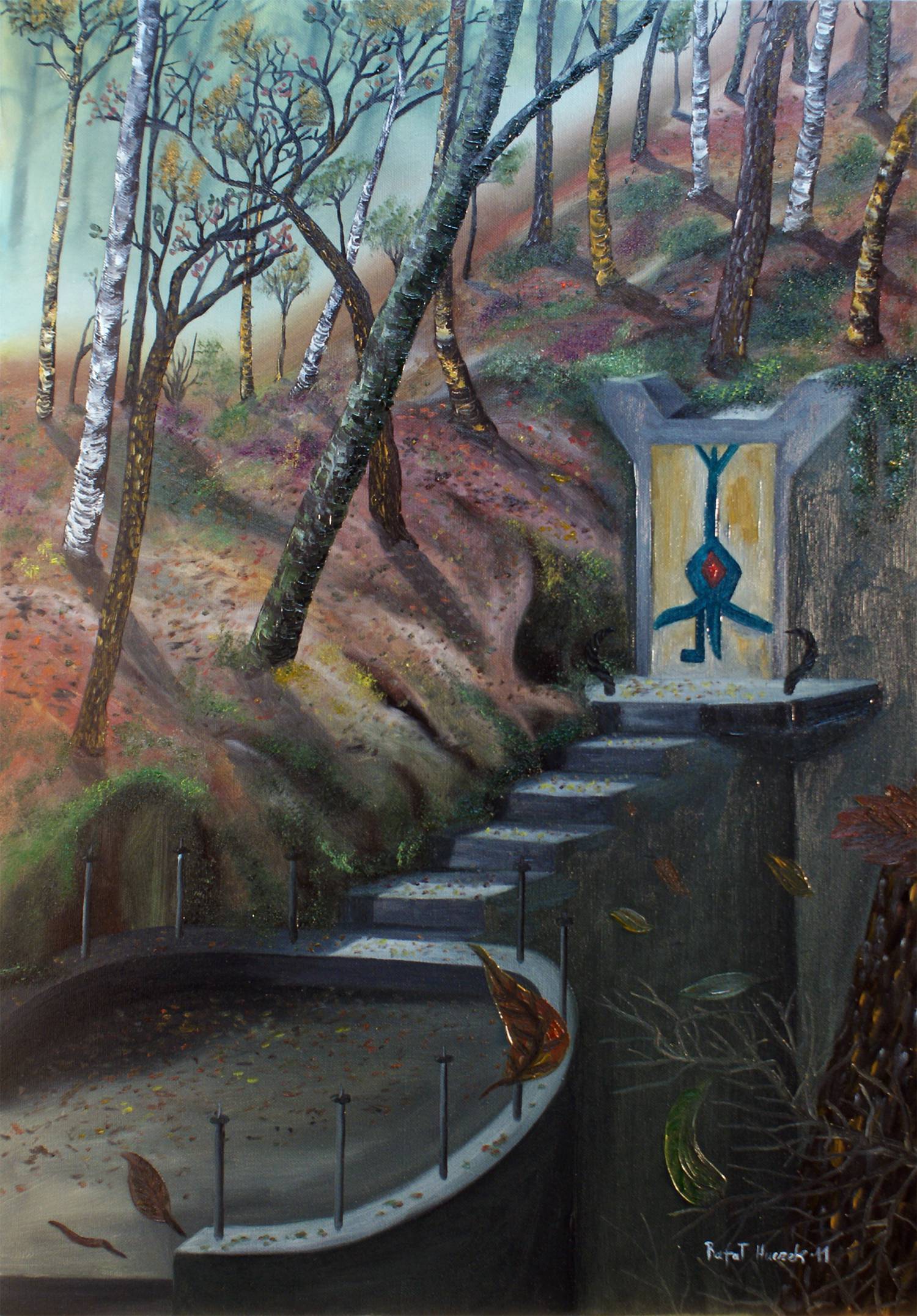 This surrealistyczny obraz to prawdziwa uczta dla oczu. Przedstawia zalesiony krajobraz z drzewami o smukłych pniach, które tańczą w gamie pastelowych kolorów. Tajemnicza konstrukcja, przypominająca starożytny portal, wprowadzona jest na pierwszym planie, z płaskorzeźbą o abstrakcyjnym wzorze. Schody prowadzą do tej konstrukcji, tworząc intrygującą linię wzroku, która przyciąga do wnętrza dzieła. Atmosfera jest pełna tajemnicy i niepewności, jakbyśmy stojąc, poczuli magiczny moment zawieszenia tuż przed odkryciem sekretu. Artysta wykorzystuje techniki mieszające realizm z fantastyką, nadając wyrazistości, a jednocześnie wprowadzając elementy oniryczne. Delikatna mgła miękko otula drzewa, co dodaje kompozycji głębi. Czy to las z mojego snu? Mamo, patrz, takie drzewa jak na huśtawce w parku! Emocje buzują, wspomnienia miejsc poznanych tylko w wyobraźni mieszają się z rzeczywistością. Obraz, choć stonowany w tonacji, wywołuje "curiosity" i potęguje pytania o to, co kryje się za tym portalem. To dzieło, które pobudza do refleksji, zachęca do podróży, nie tylko dosłownej, ale i wewnętrznej. Zachwyca, inspiruje, a jednocześnie niepokoi swoją niejednoznacznością. Fascynujące, prawda?