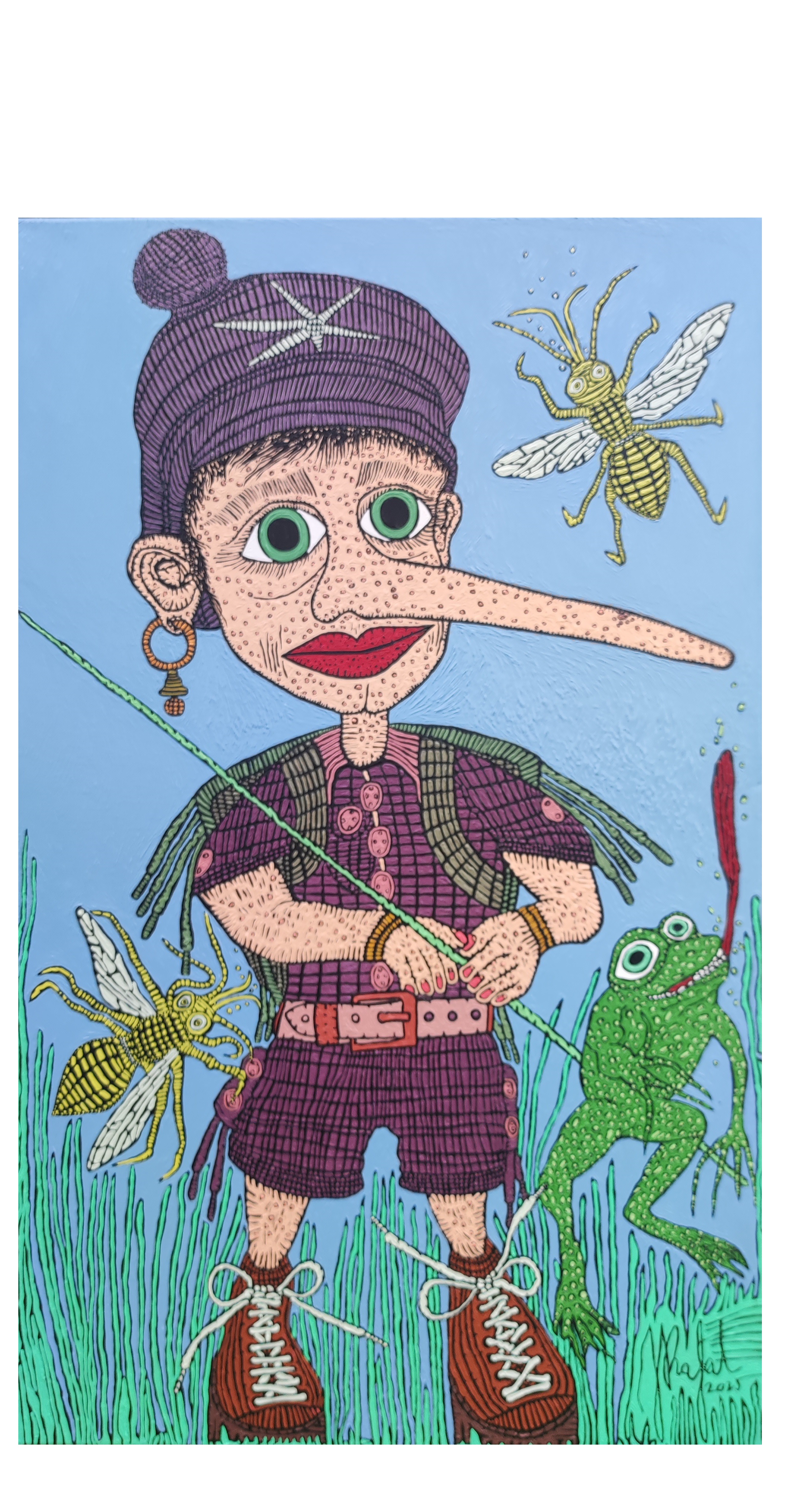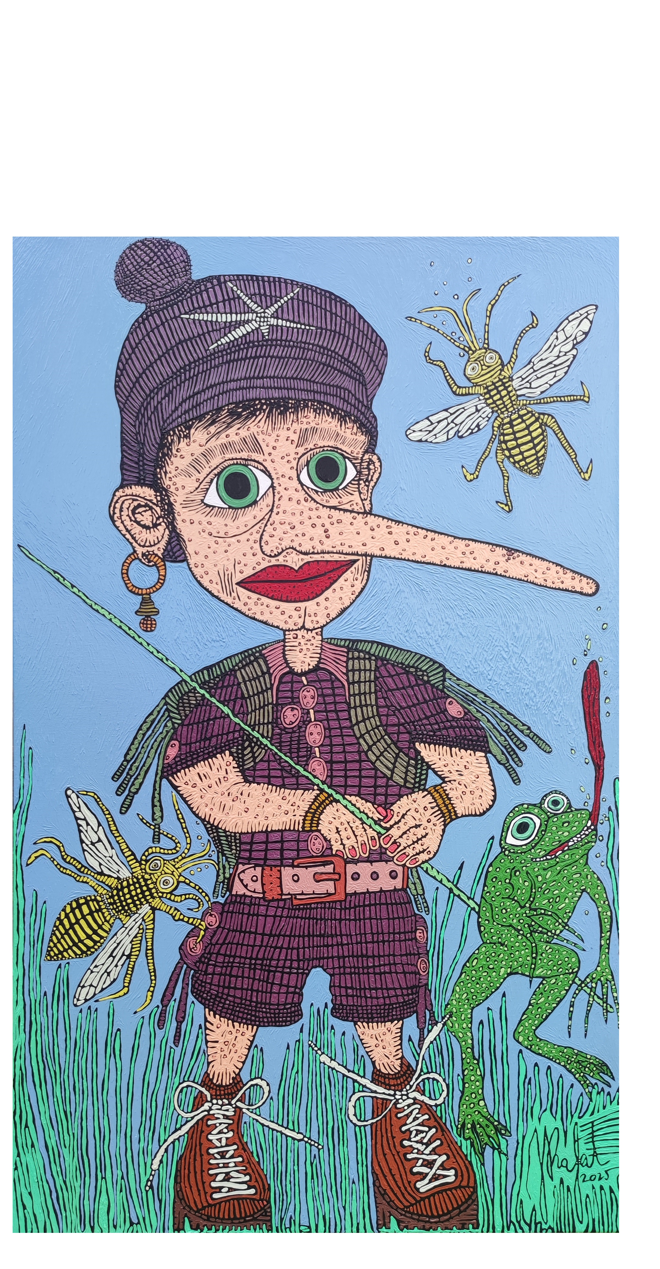 Na obrazie dominują intensywne kolory, które przyciągają wzrok jak magnes. Oto postać z wyjątkowo długim nosem, ubrana w fioletowy strój i wełnianą czapkę. Wokół niego wirują wielkie owady, a żaba przygląda się zza traw. Kolorystyka – niebieskie tło kontrastuje z zielenią i fioletem – tworzy atmosferę trochę surrealistycznego dnia na zewnątrz. To prawdziwe wow. Artysta posłużył się kreskowaną techniką, co dodaje dziełu dynamiczności i ruchu. Linie są precyzyjne, a zarazem pozostawiają wrażenie swobodnej zabawy formą. Całość przypomina trochę ilustrację z bajki, co mnie osobiście przypomina beztroskie czasy dzieciństwa. A może to Pinokio w nowym wydaniu? Ciekawe. Patrząc na ten obraz, czuję mieszankę śmiechu i zdziwienia. Czy to tylko zabawa z wyobraźnią, czy kryje się za tym głębsza historia? Who knows. Myślę, że dzieło to skłania do refleksji o tym, jak postrzegamy rzeczywistość. Jakie jest Twoje zdanie?