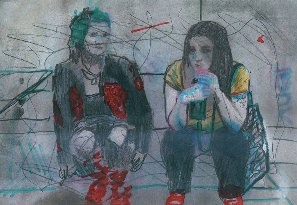 Obraz przyciąga spojrzenie swoją surową estetyką. Dominują na nim stonowane kolory szarości, przetykane zaskakującymi akcentami czerwieni i zieleni. Kompozycja wydaje się chaotyczna, z postaciami siedzącymi na ławce, zatopionymi w swoich myślach. Lewa postać, z niebieskimi akcentami we włosach, wydaje się być zagubiona, a jej sylwetka jest nieco zamazana, jakby złożona z niepewnych kresek. Prawa osoba, ubrana w kolorowe ubrania, wygląda na zamyśloną, wbija wzrok w punkt niewidoczny dla odbiorcy. Nastrój jest melancholijny, trochę jakby wszyscy mieli smutne serduszka. Artysta zastosował technikę mieszania mediów, co dodaje pracom dynamizmu. Linie jakby drżą, a plamy farby tworzą ciekawy kontrast z grafitowymi szkicami. Widowisko przypomina szybki szkic – captured moment emocji i refleksji. Obraz może wywoływać wiele emocji: od nostalgii po zagubienie. Wygląda tak, jakby te postacie mogły być częścią większej historii. Patrząc na nie, czuję przytłaczającą ciszę. Czy te osoby znają się, czy tylko się mijają? Może to przelotna chwila po długim dniu? Wyobrażam sobie, że mam siedem lat i krzyczę: „Dlaczego nikt się nie uśmiecha?” Ten obraz jest jak zagadkowa puzzle, która nie ma jednej odpowiedzi.
