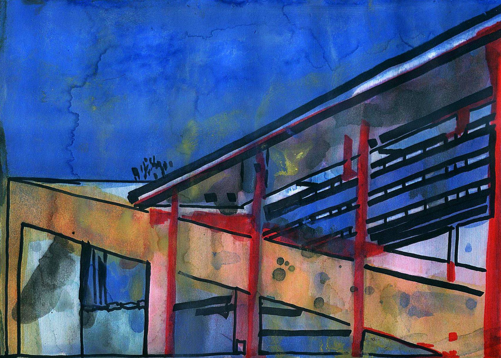 Obraz emanuje intensywnymi kolorami, w których dominują głębokie błękity kontra ciepłe pomarańcze i czerwienie. Architektoniczne kształty układają się jakby w modernistyczny krajobraz miejski, przecinane odważnymi czarnymi liniami, nadającymi całości nieco surowego charakteru. Atmosfera jest dynamiczna, niemal industrialna, z nutą tajemnicy unoszącą się nad całą sceną. Styl artystyczny sugeruje wpływy abstrakcyjnego ekspresjonizmu, gdzie techniki akwareli i tuszu tworzą niesamowitą, wodnistą teksturę powierzchni. Emocje płynące z obrazu są intrygujące, czujemy pewną nostalgię, ale i obietnicę czegoś nowego. Dla mnie obraz ten to taka "mystery", pełna ukrytych historii i miejskich legend, która zatrzymuje na chwilę i zmusza do refleksji. Krótkie spojrzenie wystarczy, by poczuć się jak odkrywca nieznanego miasta. Geometryczne formy przypominają zabawę klockami przez dziecko, a jaśniejsze plamy koloru sugerują, jakby światło igrało na fasadach budynków. "A ja widzę tu kosmiczny statek" – powiedziałby ktoś młodszy, upajając się fantazją. Ostatecznie, obraz ten łączy w sobie nowoczesność i fantazję, co sprawia, że jest nie tylko wizualnie atrakcyjny, ale i emocjonalnie angażujący.