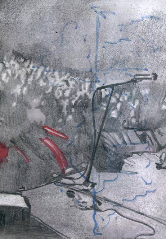 Obraz przedstawia magiczną scenę koncertową. Dominują szarości i czernie, przełamane niebieskimi i czerwonymi akcentami, które tworzą dynamiczny klimat. Jednym z centralnych elementów jest statyw z mikrofonem stojący na tle rozmarzonego tłumu. Można wyczuć emocję wyczekiwania, atmosferę pełną energii i napięcia, które unosi się w powietrzu. Technika malarska jest nieco chaotyczna, przypominająca szybkie ruchy pędzla, co dodaje dziełu spontaniczności i życia. Look! To, jak artysta połączył abstrakcję z realizmem, sprawia, że obraz jest zarówno tajemniczy, jak i porywający. Chociaż na pierwszy rzut oka wszystko wydaje się lekko zamglone, jakby pokryte delikatnym woalem, to właśnie w tym chaosie tkwi piękno tego dzieła. Widz czuje się niemal jakby sam stał przed sceną, gotowy do zanurzenia się w dźwiękach muzyki. „Wow, tam jest naprawdę dużo ludzi!” - pomyślało dziecko. Kompozycja prowokuje pytania, potencjalnie wywołuje wspomnienia z koncertów i tęsknotę za chwilami pełnymi dźwięku. To jeden z obrazów, które długo pozostają w pamięci dzięki swojej magnetycznej sile i emocjonalnemu ładunkowi.