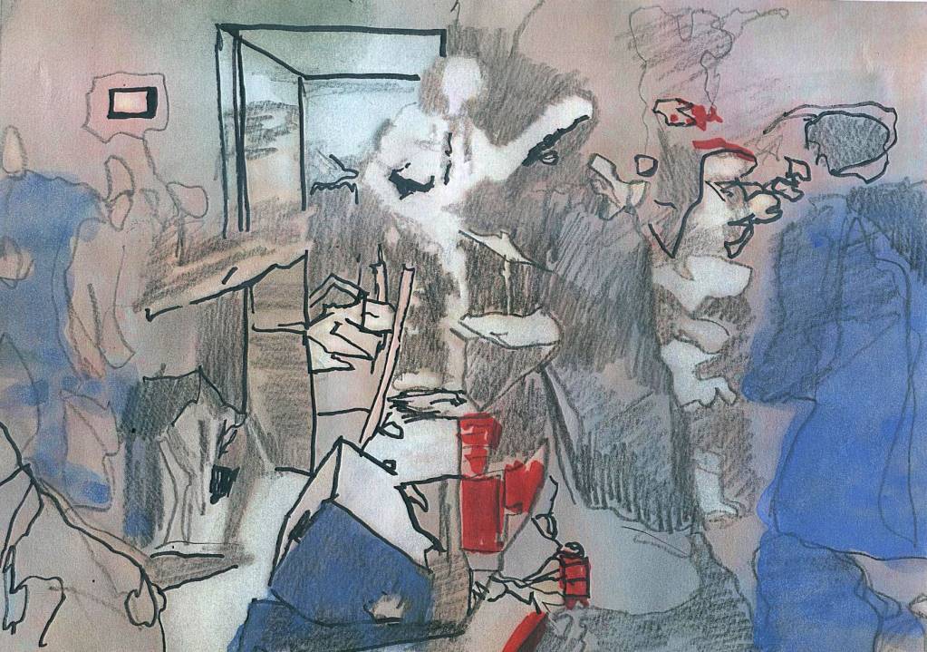 Obraz ma w sobie coś z bałaganu, takiego artystycznego chaosu, który przyciąga wzrok. Dominują miękkie, pastelowe kolory – delikatne błękity, przytłumione szarości, a to wszystko przeplecione ostrzejszymi czerwieniami. Niektóre linie wydają się rozmyte, jakby artysta ledwo ich dotknął. Centralnym punktem jest abstrakcyjna postać, może muzyk, w otoczeniu instrumentów. Czy to gitara? Ciężko powiedzieć. Kompozycja przywodzi na myśl klimatyczny koncert, tętniący wibrującą energią. Atmosfera? To jakby cichy gwar w zatłoczonym klubie. Jest spokój, ale jednocześnie rytm, coś, co cię porusza w środku. Każdy kształt, każda plama barwy zdaje się opowiadać swoją historię. Styl artysty to swobodna gra kolorów, luźne kreski, technika, która daje wrażenie niedokończenia, a jednak pełni. Trochę jak free jazz. Dzieło wywołuje emocje, budzi ciekawość. Może to nostalgia za czymś dalekim, niewyraźnym. Może widz odnajdzie tu kawałek własnych wspomnień z gorących letnich nocy. A dzieciak by powiedział: "To wygląda jak burza z kolorami!". Interesująca kompozycja przyciąga, sprawia, że chce się patrzeć i patrzeć. Feelings wibrują, ciągną cię do środka.