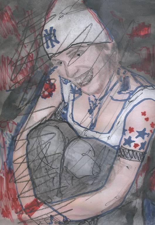 Na obrazie królują szarości i czerwienie, co daje efekt tajemniczości i lekko buntowniczej atmosfery. Zarys postaci jest dynamiczny, jakby artysta próbował uchwycić moment w ruchu. Ubrana w jasny tank top z niebieskimi elementami i czapkę z daszkiem, przypomina kogoś z ulic wielkiego miasta. Na ramionach widać czerwone i niebieskie tatuaże, które dodają charakteru i pewnej dozy rebelii. Tło jest ciemne i nieco chaotyczne, z czerwonymi akcentami, które mogą symbolizować emocje, a może i jakieś wewnętrzne rozterki. Styl artysty jest swobodny, z odrobiną ekspresjonizmu. Kreśli odważne linie, trochę tak, jakby chciał opowiedzieć historię pełną pasji i kontrastów. Jest w tym coś osobistego i intymnego, co sprawia, że obraz wydaje się prawdziwy i autentyczny. Takie podejście może odzwierciedlać próbę połączenia wewnętrznego chaosu z zewnętrzną harmonią. Patrząc na ten obraz, można poczuć nutę niepokoju, ale także ciekawości. Kim jest ta osoba? Co myśli? Jeden rzut oka i już zastanawiasz się, jakie tajemnice kryją się za tym uśmiechem. Ja bym chciała o niej wiedzieć więcej. Dla dziecka, to może być ktoś, kto właśnie wymyślił nową, zabawną zabawę. Freedom, to słowo przyszło mi na myśl, oglądając tę pełną życia scenę.