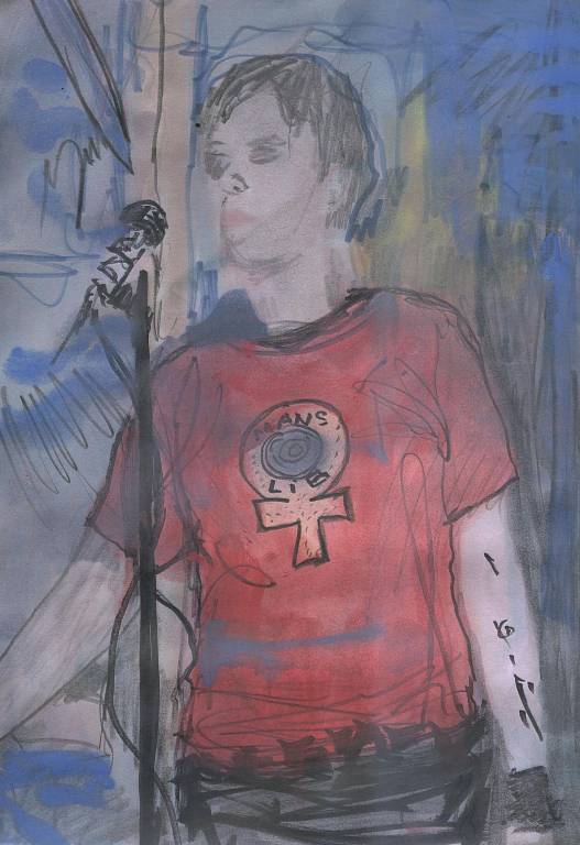 Obraz przyciąga wzrok bogactwem kolorów i luźną, nieco chaotyczną kompozycją. Dominuje tu czerwień koszulki z napisem “Trans Life”, która kontrastuje z niebieskimi i szarymi plamami w tle. Kreski są dynamiczne, a kontury postaci niedokładne, co dodaje dziełu ekspresji i spontaniczności. Nastrój tej pracy jest melancholijny, może trochę tajemniczy. Przez niedopowiedziane tło wydaje się, jakby cała scena była zanurzona w gęstej mgle emocji. Artystyczne techniki użyte tutaj to mieszanka akwareli z rysunkiem tuszem, która nadaje obrazowi "fluid" charakter i pewną nietrwałość. Emocje? Och, jest tego sporo. Patrząc, czuję coś między smutkiem a nadzieją. Można sobie wyobrazić, że postać na obrazie stoi na scenie, śpiewając o swoim życiu. Może to symbol walki o akceptację? Dzieciak mógłby powiedzieć: ten pan śpiewa piosenkę o kosmosie, bo jego koszulka wygląda jak rakieta. Obraz wywołuje wiele interpretacji i refleksji. Jest tu swego rodzaju "moc" w tej prostocie i niedoskonałości linii, która zmusza do zatrzymania się na chwilę i zastanowienia.
