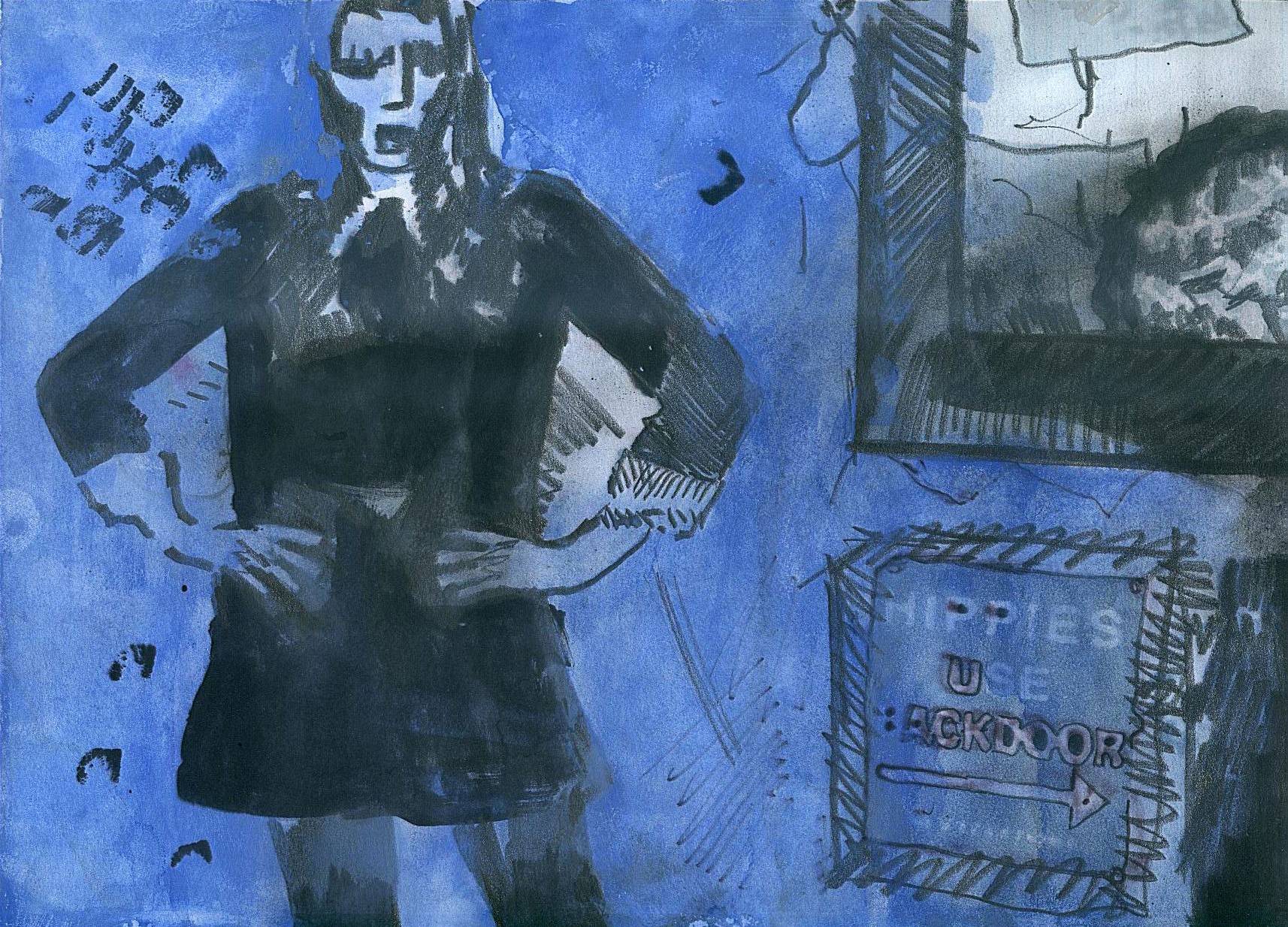 Na tym obrazie dominują odcienie niebieskiego i czarnego, które nadają całości chłodny i nieco tajemniczy charakter. Postać kobiety na pierwszym planie, z rękami na biodrach, emanuje pewnością siebie i siłą. Wyrazistość kształtów nie jest pełna, co nadaje jej postaci aurę niedopowiedzenia. Otaczający ją szkicowy klimat, przypomina ulotność chwili uchwyconej na szybko. Tło zdobią napisy i strzałki, które dodają kompozycji nieco chaosu, ale też humoru, niczym graffiti w stylu street art. Atmosfera obrazu jest jednocześnie napięta i nieco nonszalancka. Można odnieść wrażenie, że znajdujemy się w alternatywnej rzeczywistości, gdzie zasady są inne. Technika jaką posłużył się artysta, z użyciem tekstury i kreski, podkreśla jednocześnie dynamikę i niepewność przedstawionej sytuacji. Obraz budzi różnorodne emocje. Z jednej strony może być kojarzony z buntem młodości, z drugiej zaś – z poszukiwaniem wolności. Wzbudza ciekawość. Czemu ulica jest pusta? Tak myśli dziecko, które widzi ten obraz i wyobraża sobie przeróżne historie. A ja? Czuję jakbym przeszukiwał uliczki wielkiego city, gdzie każdy zakręt skrywa nową tajemnicę.