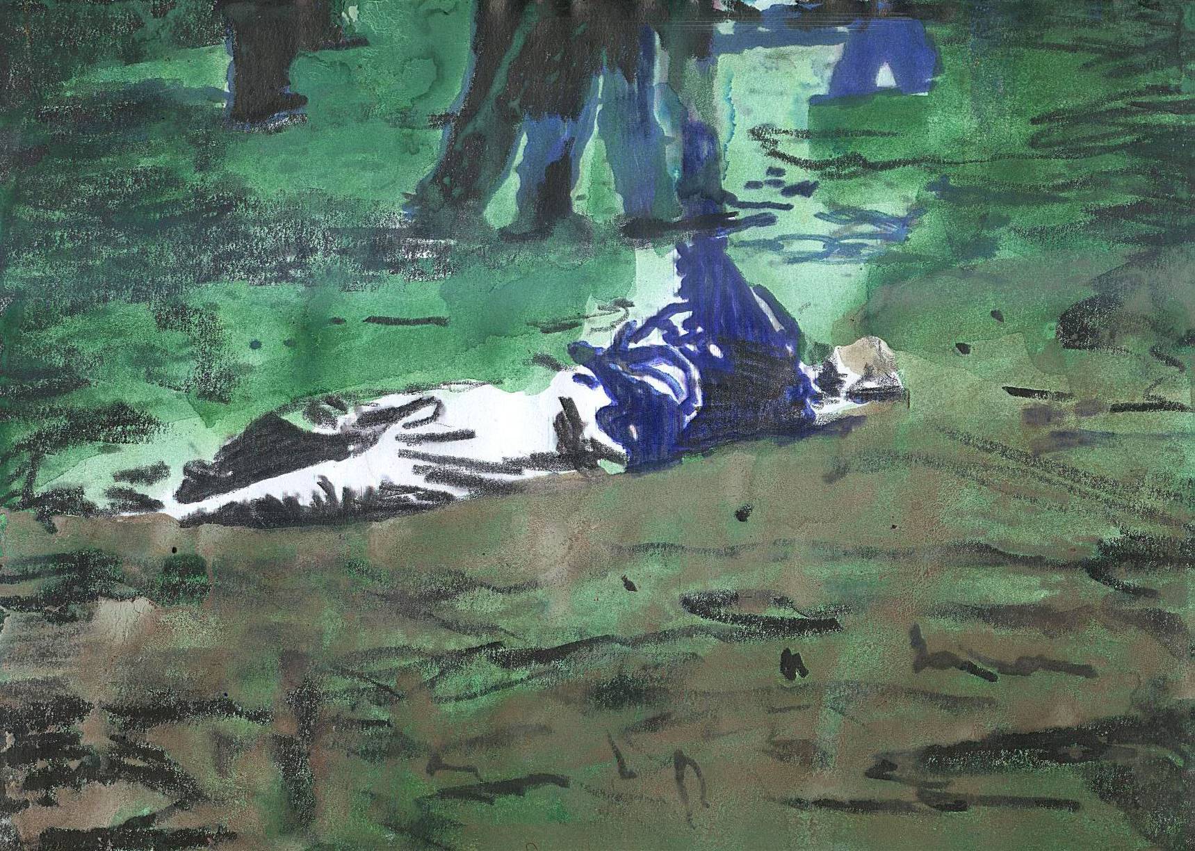 Obraz przedstawia tajemniczą scenę na zielonkawym tle, gdzie dominują odcienie zieleni i brązu, przywodząc na myśl głęboki las lub park w pełni lata. W centrum leży postać ubrana w niebieski strój, co kontrastuje z otaczającym ją środowiskiem. Technika malarska jest dość impresjonistyczna: pociągnięcia pędzla są luźne i swobodne, tworząc wrażenie nieco rozmytej rzeczywistości. To może przypominać o technice watercolor, która czasem pozwala naścieżna subtelność. Atmosfera jest melancholijna, jak się patrzy. Może kojarzy się z chwilą relaksu, ale też smutku. Jakby czas się zatrzymał. Dla mnie, scena sugeruje zatrzymanie się w biegu życia, chwilę zastanowienia. Trochę takie dreamlike. Ten kontrast między spokojem a niepewnością sprawia, że obraz ma wyjątkową głębię emocjonalną. Hmm, a może byłem w tym miejscu? Gdy byłem dzieckiem, marzyłem o leżeniu na trawie pod drzewami i obserwowaniu chmur. Ciekawe, czy to miejsce może przywołać wspomnienia u każdego. Patrząc na to dzieło, czuję nostalgię za czasami beztroskiej zabawy i dziecięcej wyobraźni.