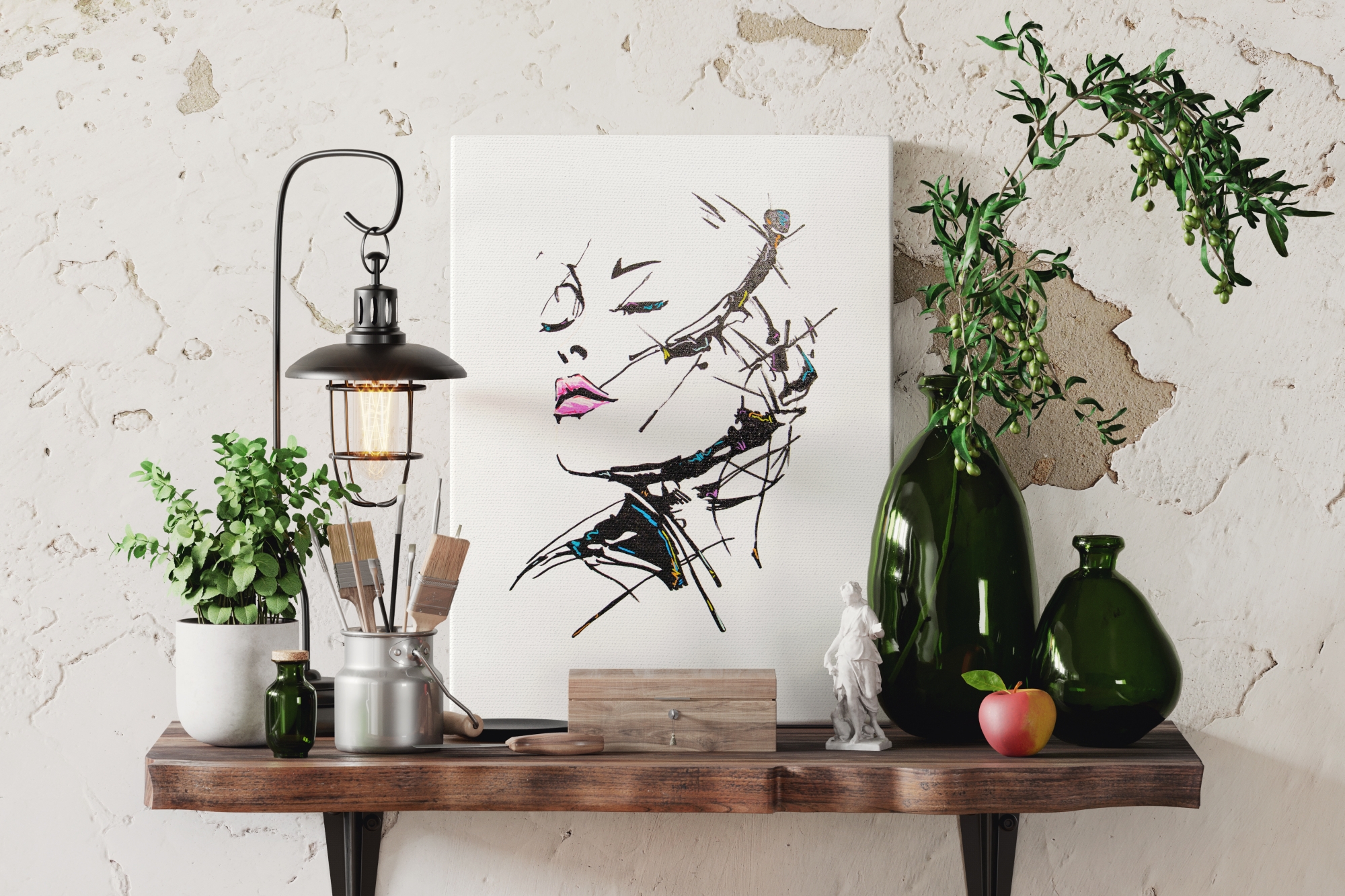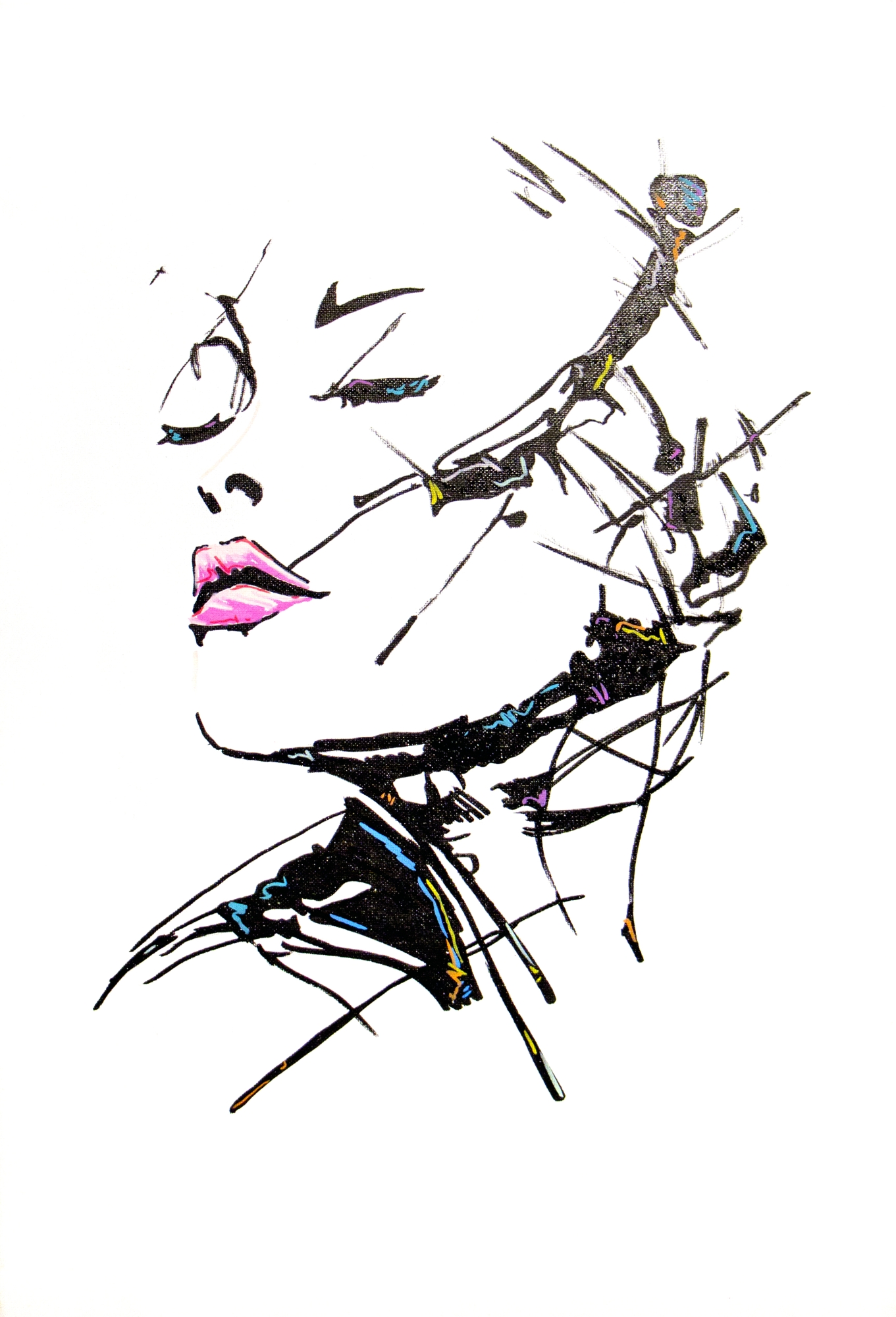Uwodzenie to obraz akrylowy na płótnie, który operuje skrajnym uproszczeniem formy i siłą gestu, budując napięcie pomiędzy obecnością a niedopowiedzeniem. Twarz kobiety wyłania się z bieli tła jedynie poprzez kilka zdecydowanych linii, fragmentarycznych plam koloru i dynamicznych, niemal nerwowych pociągnięć. To portret bardziej emocji niż postaci – zapis chwili, spojrzenia, sugestii. Kompozycja opiera się na kontraście między delikatnością a ekspresją. Miękkie, różowe usta stają się centralnym punktem obrazu, przyciągając wzrok i nadając całości zmysłowy charakter. Oczy, ledwie zaznaczone, pozostają niejednoznaczne – półprzymknięte, jakby zawieszone pomiędzy zaproszeniem a dystansem. Linie rysunku są nieregularne, łamane, miejscami gwałtowne, co wprowadza napięcie i dynamikę. Czerń konturu zestawiona z drobnymi akcentami koloru – błękitem, żółcią, fioletem – buduje rytm i wrażenie ruchu. Biała przestrzeń nie jest pustką, lecz świadomie pozostawionym polem ciszy, które wzmacnia ekspresję formy i pozwala gestowi wybrzmieć. Fragmentaryczność twarzy potęguje wrażenie ulotności – jakby obraz przedstawiał moment tuż przed zniknięciem lub tuż po spojrzeniu. Uwodzenie nie opowiada historii wprost. To gra sugestii, napięć i niedomówień, w której forma staje się językiem emocji. Obraz porusza temat relacji, spojrzenia i zmysłowego kontaktu, ale czyni to w sposób subtelny, pozbawiony dosłowności. To malarska interpretacja stanu – chwili, w której uwaga, gest i obecność mają większą siłę niż pełny obraz.