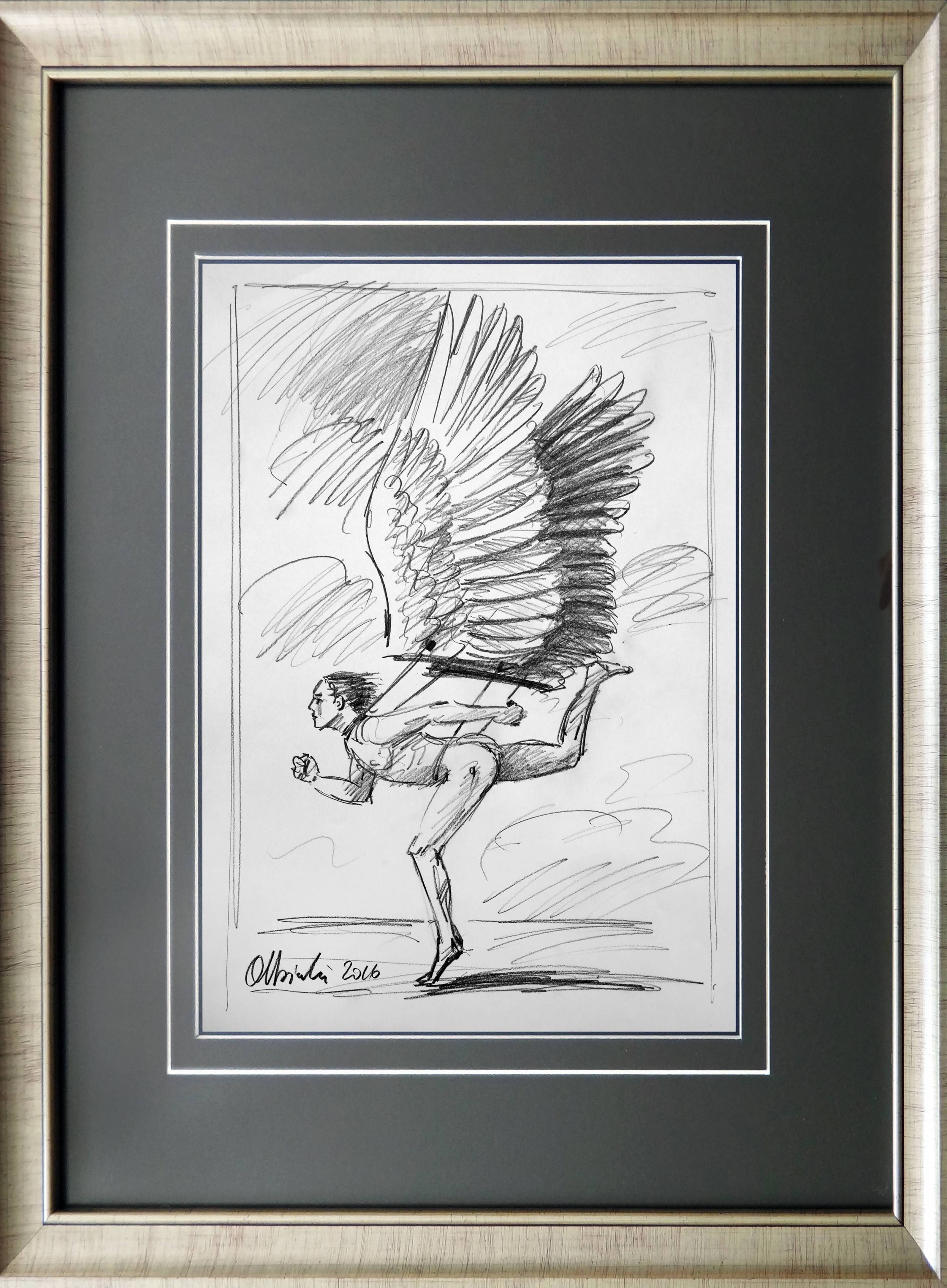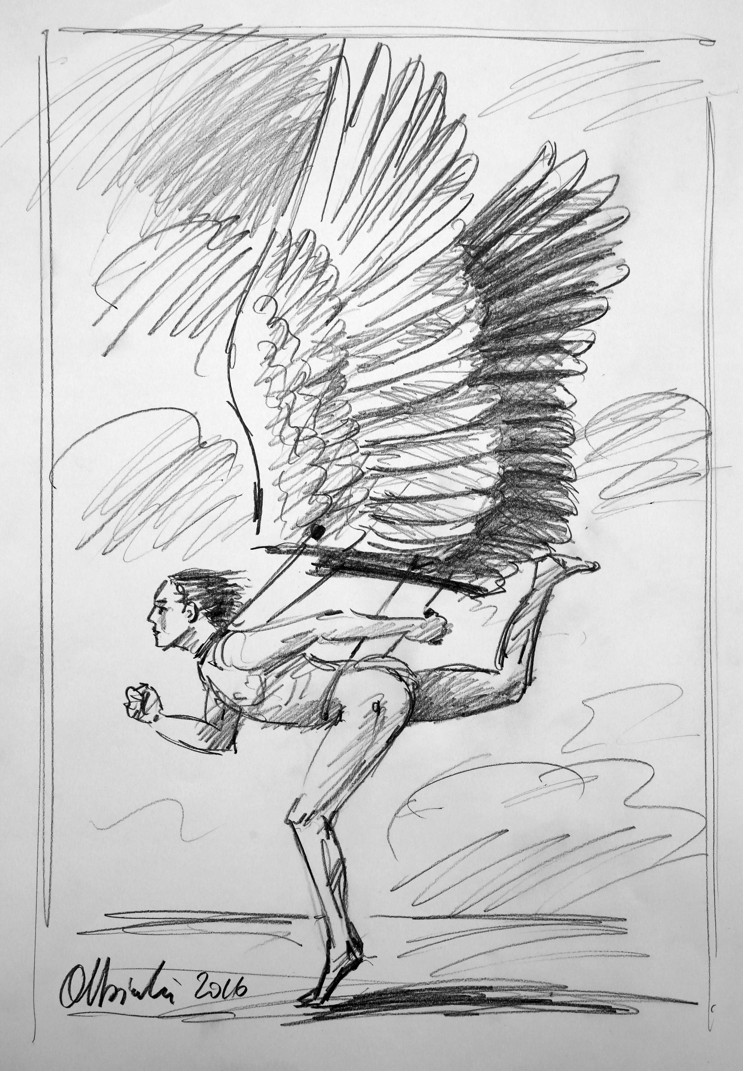 Obraz to niezwykle interesująca i dynamiczna kompozycja, w której dominuje kontrast między delikatnością a ekspresją. Centralna postać z wielkimi, rozpostartymi skrzydłami przyciąga uwagę swoją energią i ruchem. Czerń i biel rysunku dodają dramatyzmu, podkreślając emocjonalne napięcie. Artysta użył szybkich, zdecydowanych linii, które tworzą poczucie ruchu, jakby postać zaraz miała wznieść się w powietrze. Kiedy patrzę na ten rysunek, czuję jakbym mógł sięgnąć gwiazd. To prawdziwe misterium artystyczne, które zachęca do refleksji. Styl jest bardzo szkicowy, co dodaje mu surowości i prawdy. Jest jak nie do końca ukończona myśl, jakby artysta chciał dać widzowi pole do własnej interpretacji. Dla mnie to trochę jak sen. Wskazuje na ludzką tęsknotę za wolnością, przekraczaniem własnych granic. Może jest to historia Ikarowego lotu, ale w bardziej nowoczesnej wersji skąd no one falls. Obraz wywołuje uczucie nadziei i nostalgii jednocześnie. Myślę sobie, że dzieci widząc to mogłyby powiedzieć: “on chce latać jak ptak!” W tym wszystkim jest nieodparte piękno, które trudno zamknąć w słowach.