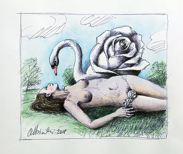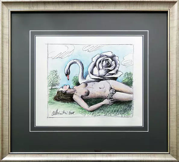 piórko i akwarela na papierze, format 27x33 cm (w ramie około 58x65 cm)