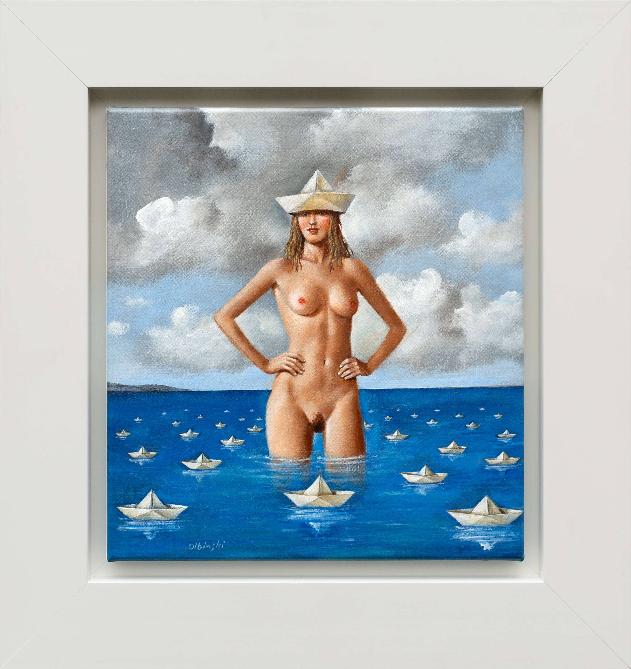 "Lady Hamilton in attendance", rok 2020, olej na płótnie, format 36x33 cm (w ramie 53x50 cm) Obraz przedstawia kobietę (tytułową Lady Hamilton) stojącą w wodzie, sięgającej jej do bioder. Kobieta jest naga, z wyjątkiem papierowej czapki na głowie, przypominającej tradycyjny kapelusz z papieru, często widywany w dziecięcych zabawach. Jej dłonie znajdują się na biodrach. Woda wokół niej jest spokojna i błękitna, a na jej powierzchni unoszą się papierowe łódki, wszystkie identyczne w formie i rozrzucone równomiernie. Tło to niebo pokryte chmurami, tworzące kontrast z błękitem wody. Widoczna jest także odległa linia brzegowa, sugerująca otwartą przestrzeń morską. Obraz emanuje surrealizmem i poetyckim nastrojem. Papierowe łódki dodają element dziecięcej fantazji i zabawy, a jednocześnie wprowadzają do sceny symbolikę delikatności i przelotności. Zestawienie nagiej postaci z prostymi formami origami może być interpretowane jako komentarz do kruchości człowieka i jego marzeń. Subtelne użycie kolorów oraz detale chmur tworzą jednocześnie dramatyczną i spokojną atmosferę.