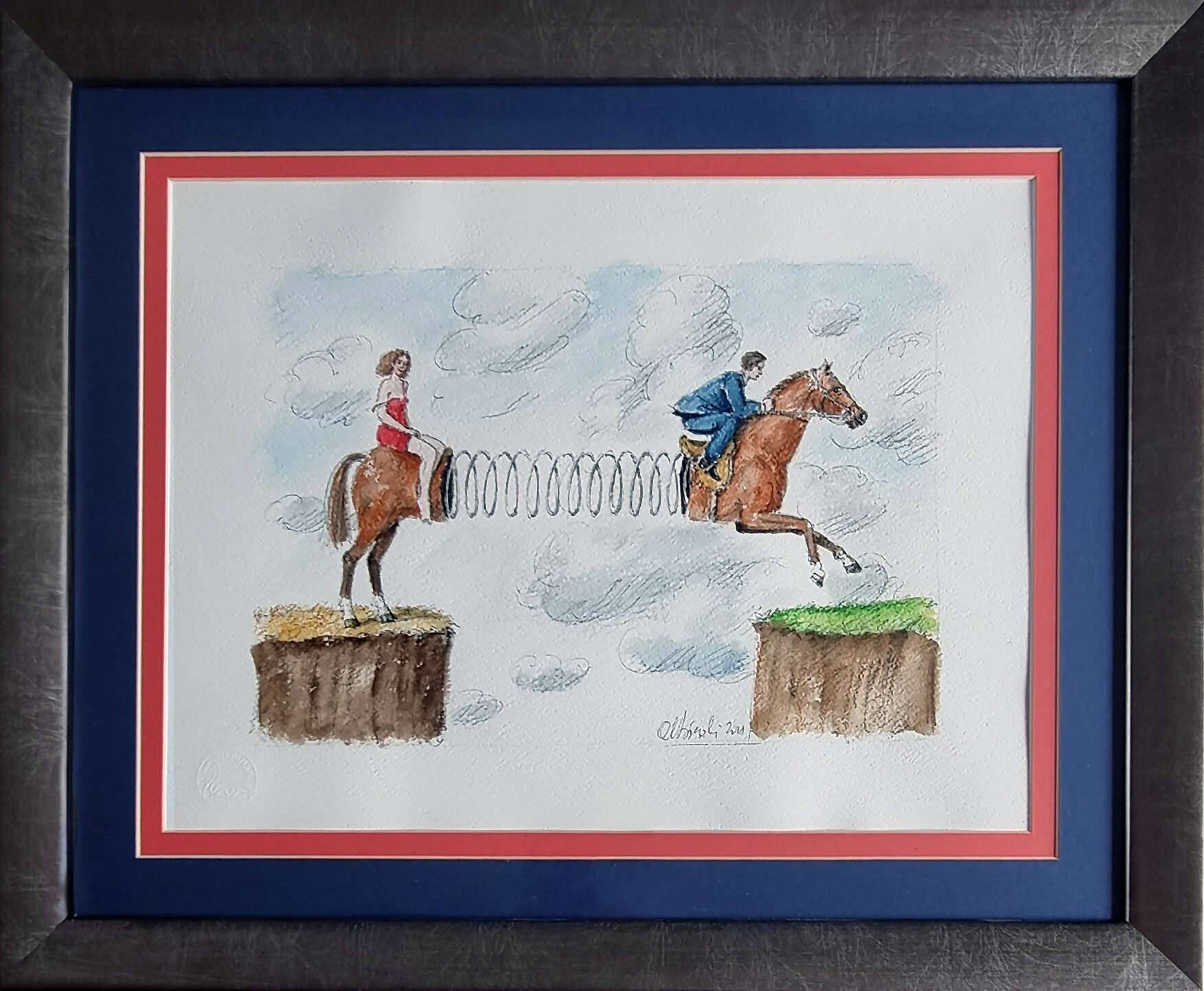 Na obrazie widzę dwie skarpy z brunatną fakturą i kępką zieleni po prawej, pod błękitnym niebem pełnym mlecznych chmur. Po lewej kobieta w czerwieni siedzi na zadu konia, po prawej mężczyzna w granacie pędzi na jego przedzie, jakby skok miał urwać się w pół. Obie części łączy sprężyna, śmiesznie i troche strasznie. Pociągnięcia akwarelowe, lekkie cieniowanie i suchy pędzel tworzą szkicową, przewiewną kompozycję. To scena surrealistyczna, żart i przestroga. Koń jest jak zabawka z gumką i skacze bardzo daleko. Atmosfera to napięcie i cisza, dziwnie weird. Myślę o relacjach na dystans, elastycznym przywiązaniu które jednak boli. Ja naprawde chcę wiedzieć kto puści pierwszy.