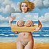 Obraz przedstawia surrealistyczną scenę na plaży, gdzie kobieta stoi z obrazem na tle wody. Dominują ciepłe kolory: błękit nieba, piasek złoty i delikatne odcienie skóry. Centralny punkt to kobieta trzymająca płótno z dwoma muszlami przypominającymi oczy. Jej włosy falują na wietrze, dodając dynamiki i swobody. Atmosfera jest spokojna, ale zdecydowanie intrygująca. Artysta użył realistycznych technik malarskich, łącząc je z fantastycznym twistem. Wygląda to trochę jak dream, prawda? Trochę to wszystko tajemnicze, prawda? Obraz może w nas wywołać poczucie niepewności, ale też fascynacji. Przypomina mi wakacje nad morzem, gdy patrzyłem na fale. Dla kogoś to może być opowieść o tożsamości, ukrytej pod warstwami fantazji. Gdy tak patrzę na to dzieło, myślę, że każde spojrzenie może odkryć coś nowego. Kurcze, każdy dzień to nowa historia, a ten obraz to tylko mały fragment. A u dołu, muszla na brzuchu kobiety wydaje się delikatnym akcentem natury, która scala całość.