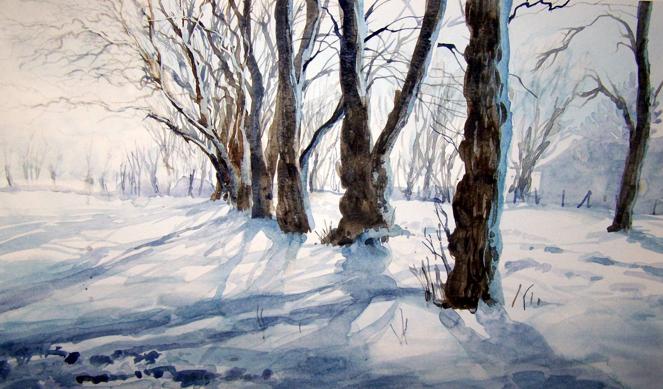 Akwarela na papierze D&R, 48x28 cm, pochodząca z 2009 r. Oprawa za szkłem, z białym passe-partout, w ramce cienkiej "stare złoto". Przedstawia aleję w pobliżu dworu w miejscowości Bortatycze. Akwarela stanowi część dyptyku.