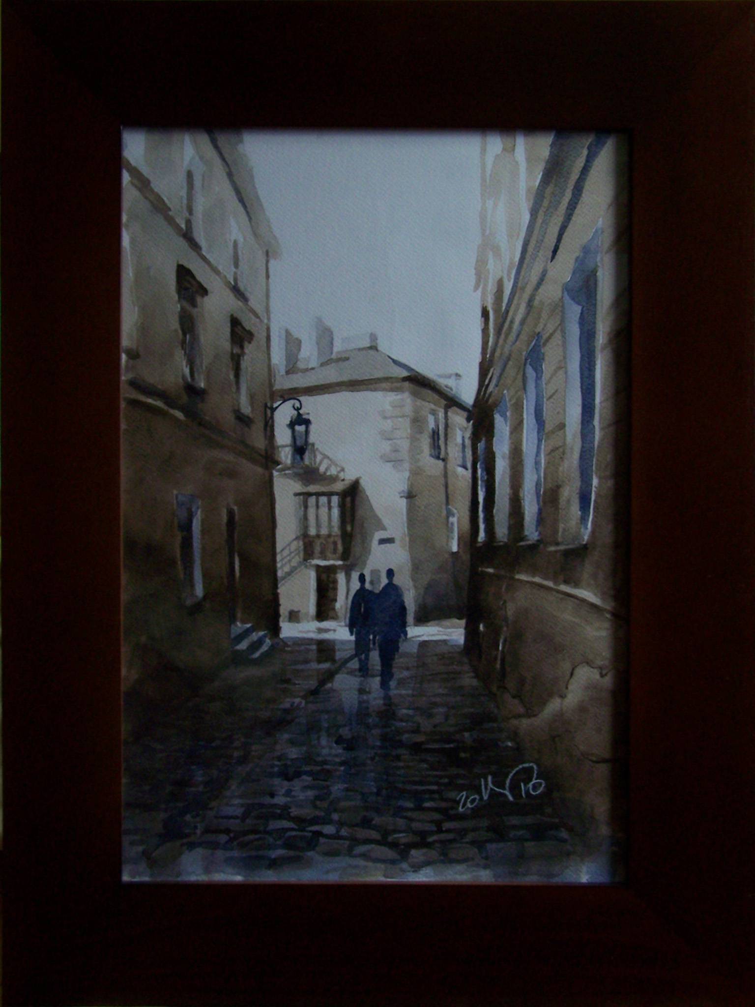 Akwarela dwubarwna na papierze D&R. Obraz pochodzi z wystawy "Spacer I - Stare Miasto". Przedstawia ulicę Olejną w Lublinie.