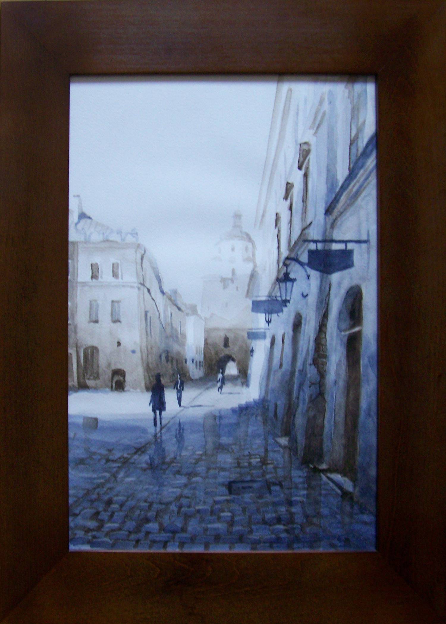 Akwarela dwubarwna na papierze D&R. Obraz pochodzi z wystawy "Spacer I - Stare Miasto". Przedstawia widok na Bramę Krakowską w Lublinie.