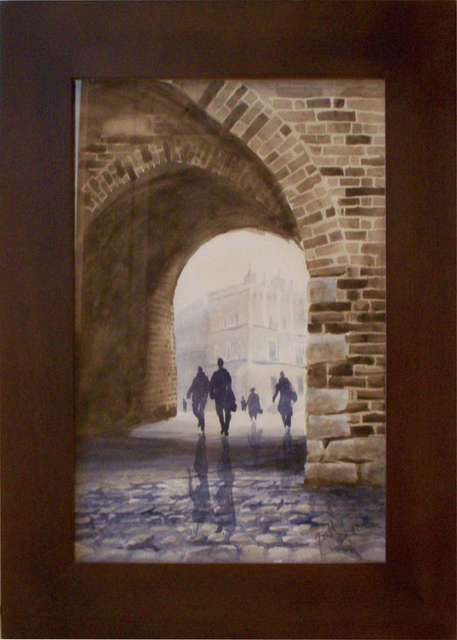 Akwarela dwubarwna na papierze D&R. Obraz pochodzi z wystawy "Spacer I - Stare Miasto". Przedstawia widok na Bramę Krakowską w Lublinie od strony Krakowskiego Przedmieścia.