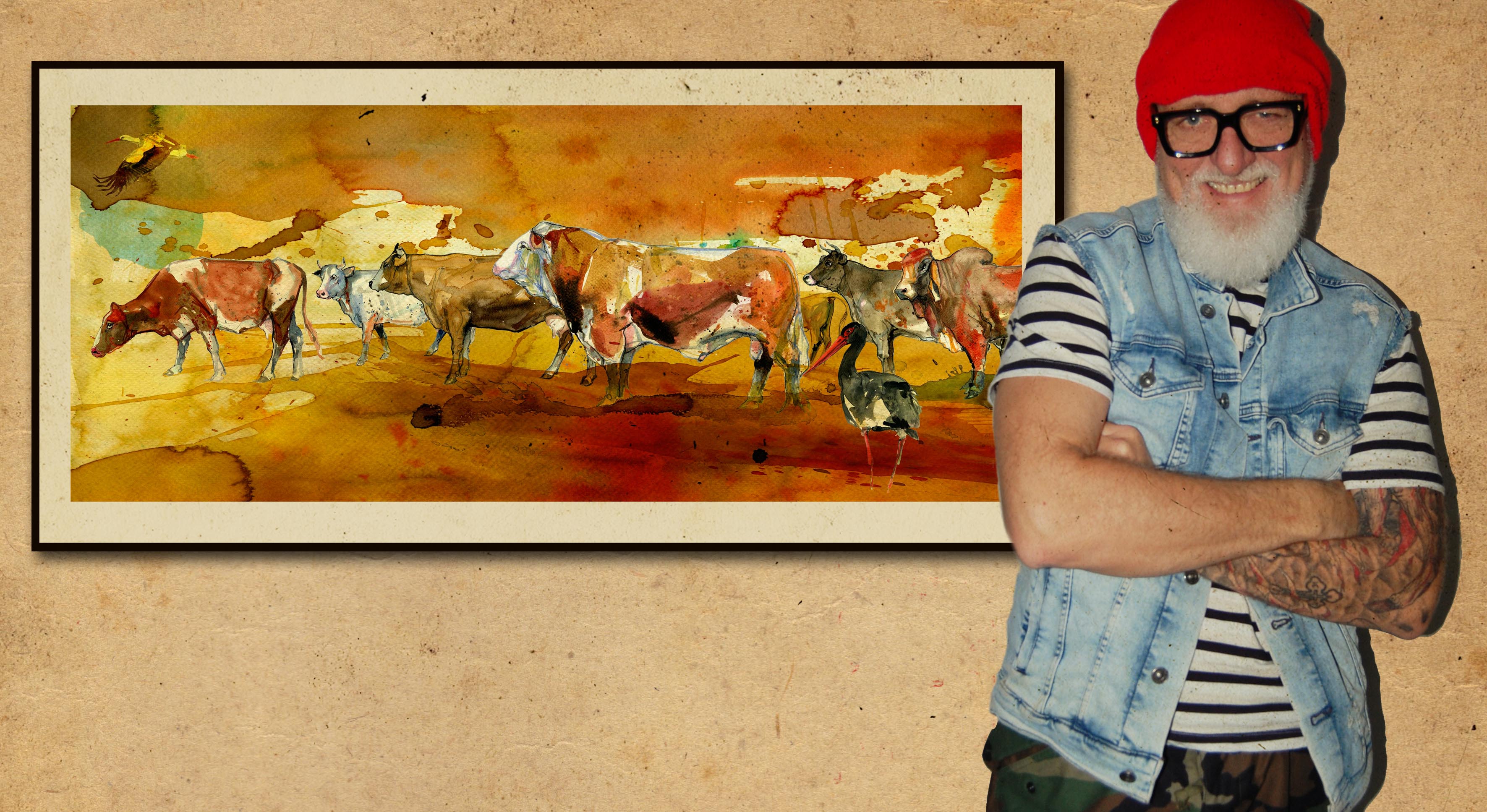 Obraz przedstawia sielankową scenę na wiejskiej łące, gdzie w centrum znajdują się stado krów. Dominują ciepłe barwy – odcienie brązów, złota i delikatne plamy bieli, które nadają całości lekkości. Kompozycja malarska jest harmonijna, krowy ułożone są w rzędzie, a ich obłości delikatnie kontrastują z bardziej płaskim tłem. Na niebie widać przelatującego ptaka, który dodaje dynamiki. Atmosfera tego dzieła jest spokojna, pełna nostalgii za prostym życiem na wsi. Artysta użył techniki akwareli, co widać w płynnych przejściach kolorów i miękkich konturach. Czasami mam wrażenie, że czuć zapach trawy i słońca. Obraz może wywołać uczucia relaksu i tęsknoty za beztroską. Przypomina mi moje wakacje u babci, kiedy biegałem po polu. Wow, ile tam było krów! Te smugi farby, jakby niewyraźne plamy, dodają mu rustykalnego "charm". Naprawdę można się zatopić w tej scenie, myśląc o prostocie i pięknie natury.