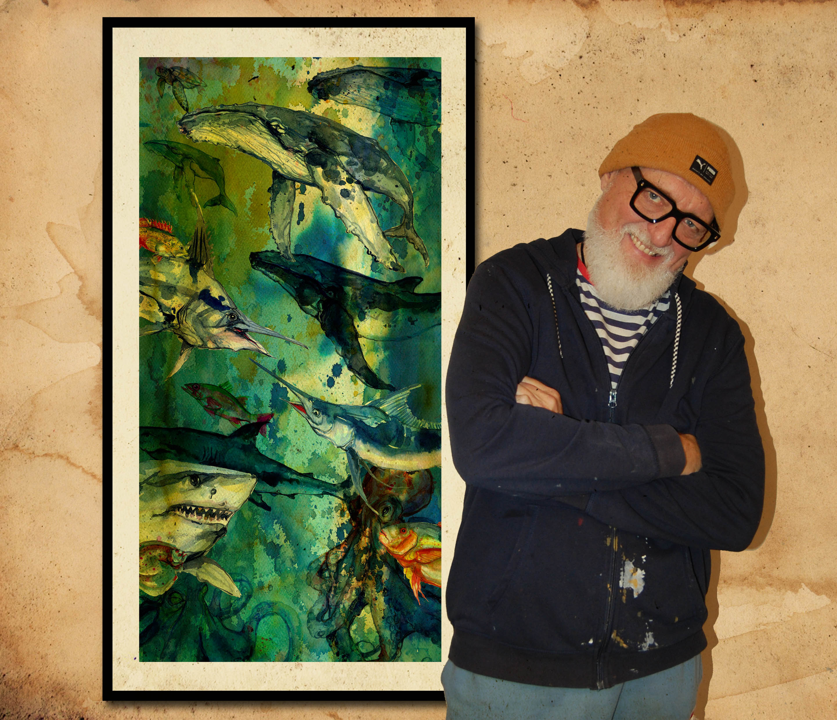 Obraz przedstawia tętniący życiem podwodny świat, pełen różnorodnych stworzeń, takich jak rekiny, wieloryby i kolorowe ryby. Dominują zieleń i błękity, które nadają całości spokojny, lecz tajemniczy nastrój. Zwierzęta wydają się płynąć w eleganckiej harmonii, a ich kształty są dynamicznie wyłaniają się z głębi morskiego tła. Artysta zastosował akwarelę, co daje efekt płynnych przejść kolorów i subtelnych refleksów światła. Atmosfera dzieła jest fascynująca. Czujesz się jak odkrywca schodzący w nieznane. Jest tu trochę „wow factor”, bo trudno oderwać wzrok od tego wodnego baletu. Można prawie usłyszeć szum oceanu i plusk fal. Ten obraz wywołuje emocje związane z poszukiwaniem przygód i odkrywaniem tajemnicy. Myślisz sobie: Chciałbym tam być! Styl artysty przypomina nieco impresjonizm, gdzie nacisk kładziony jest na uchwycenie chwilowego wrażenia. Ryby są pełne życia, a każde spojrzenie odkrywa kolejne detale. W jednym miejscu, nagle dokłada się uczucie, że słychać śmiech dziecięcia: "Patrz, mamo, rekin!" To, co szczególnie przyciąga, to swobodny i ekspresyjny sposób, w jaki rzeczone malowidło tworzy narrację. Jest w tym coś magicznego, prawda? Fantastic journey through ocean depths. I właśnie dlatego warto stanąć przed tym dziełem i pozwolić, by pochłonęło nas w niekończący się taniec fal i stworzeń.