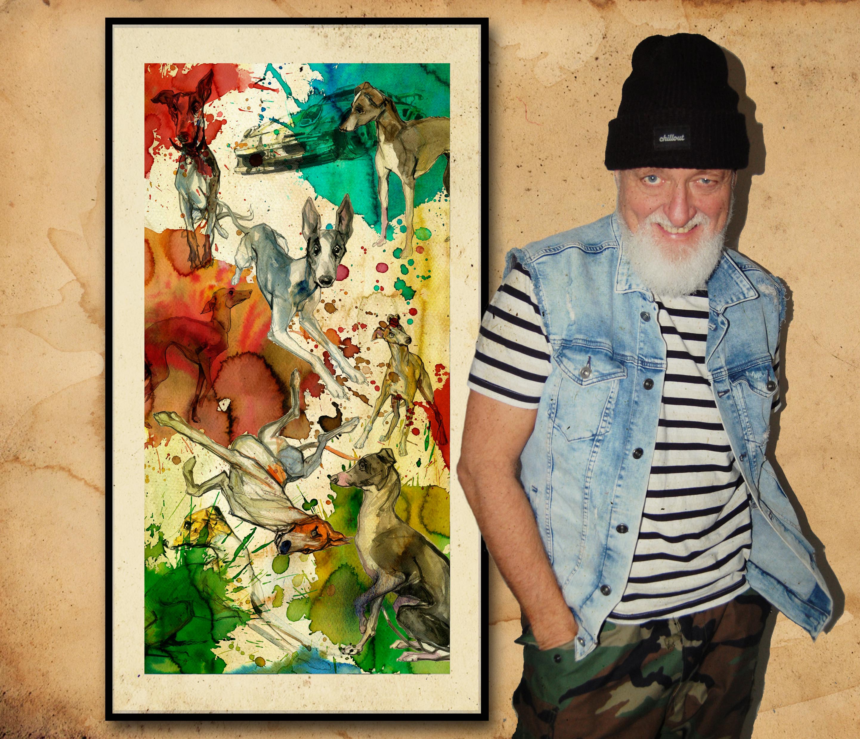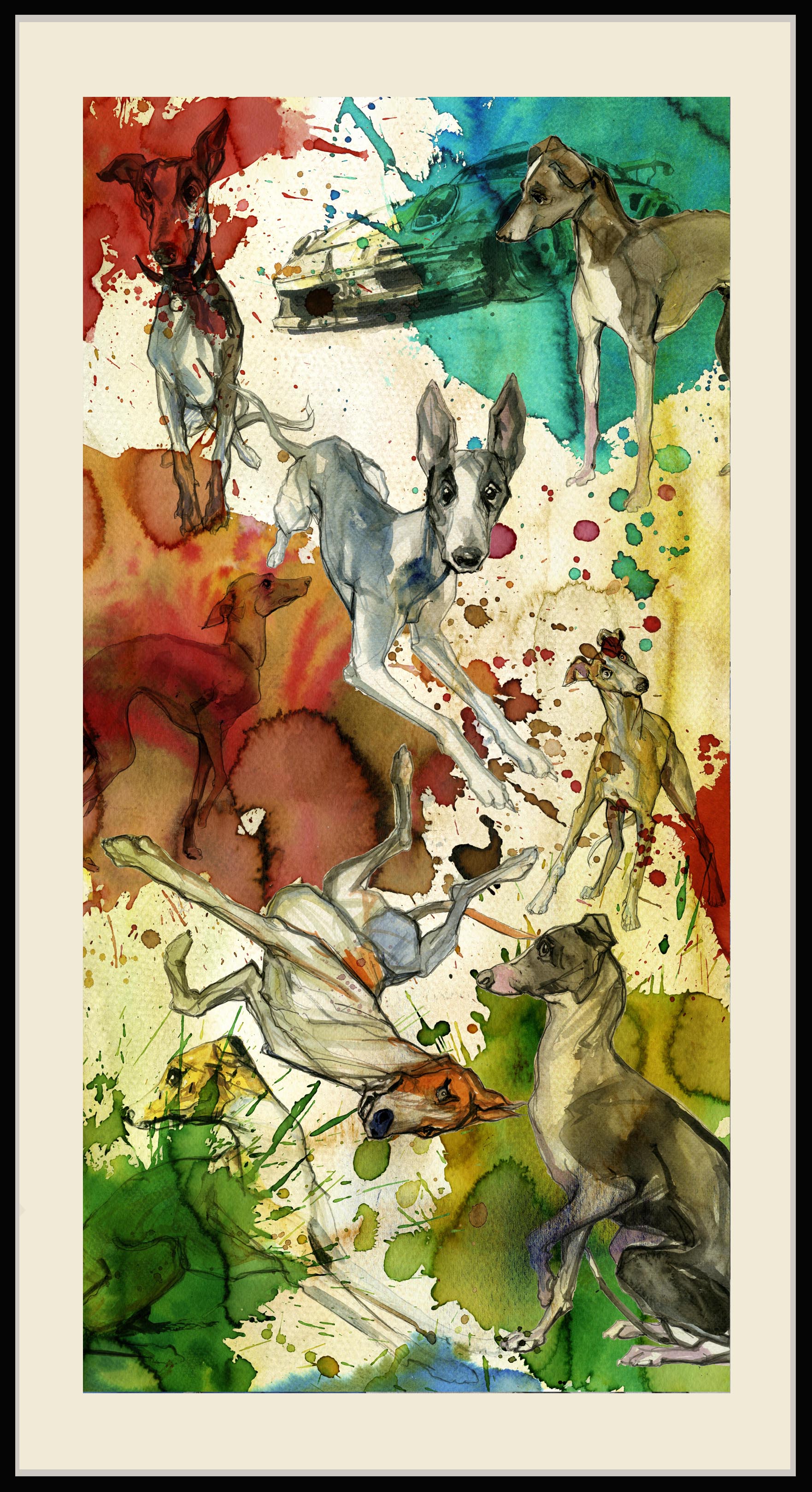 Obraz to prawdziwy festiwal kolorów i energii. Psy, których sierść mieni się w odcieniach zieleni, niebieskiego i czerwieni, zdają się tańczyć w żywiołowym chaosie. Tło, złożone z intensywnych plam i rozmytych kolorów, dodaje dynamiki, tworsząc wrażenie, jakby wszystko było w ruchu. Artysta użył techniki akwarelowej, która daje lekkość i przejrzystość kompozycji, przypominając senne krajobrazy. Obraz emanuje radością i spontanicznością. Czuję, jak uśmiech sam pojawia się na twarzy, zwłaszcza że to trochę wygląda jak komiks z dziecięcych lat. Technika free-flowing sprawia, że każdy szczegół wydaje się wibrować energią. Wiesz, jak czasem patrzysz na coś i po prostu czujesz, że life is beautiful? To jest to. Dziecko powiedziałoby: "Patrz, jaki fajny piesek!". Obraz może przywołać wspomnienia beztroskiego dzieciństwa i zabaw z pupilem. Atmosfera jest pełna optymizmu, chociaż gdzieś daleko słychać echo nostalgii.