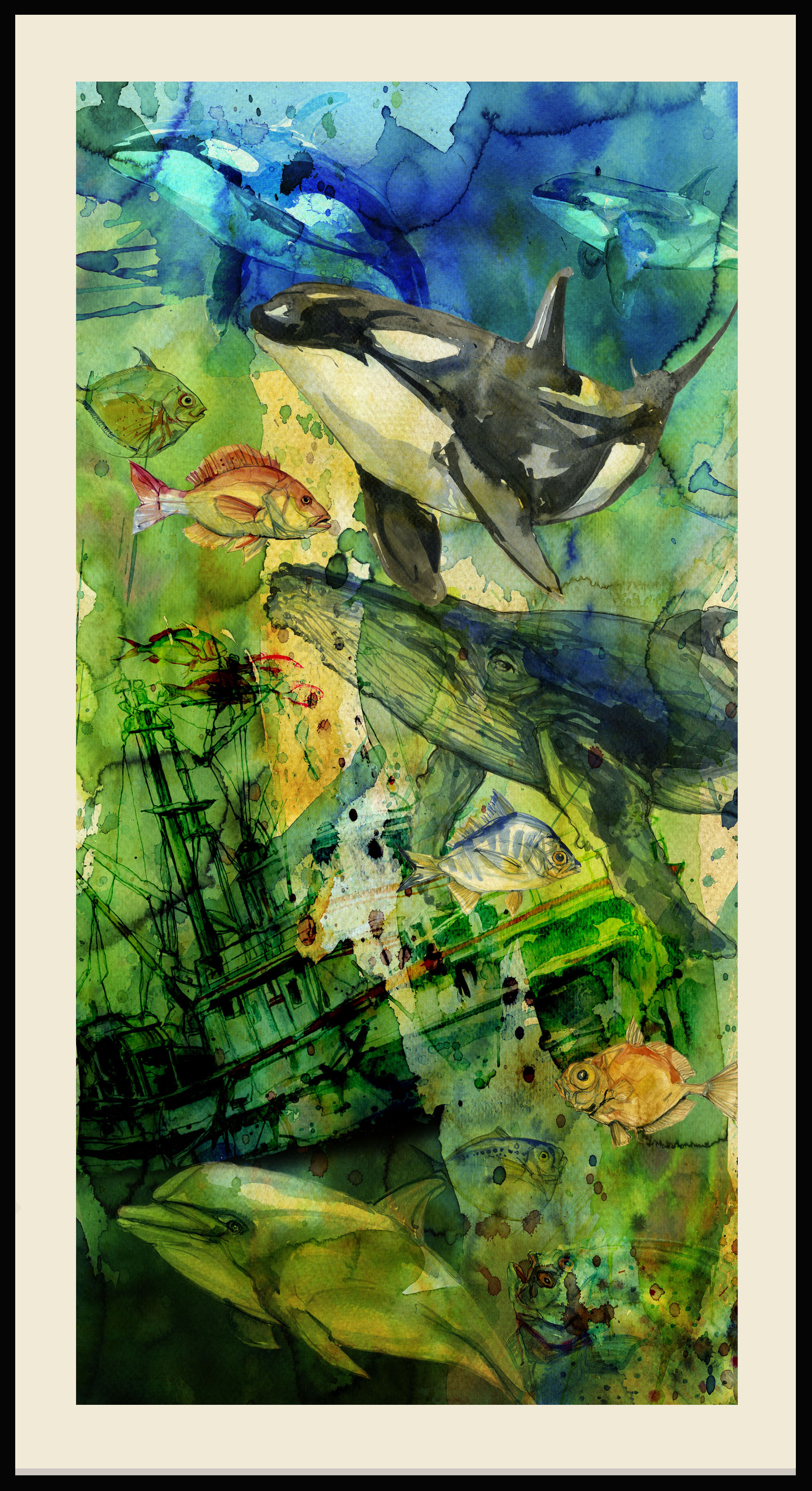 Obraz to niezwykle kolorowa kompozycja, która przenosi nas w magiczny świat podwodny. Dominują tu odcienie zieleni i błękitu, tworzące tło, na którym tętni życie morskie. W centrum uwagę przykuwa orka, majestatyczna i pełna gracji, otoczona przez różnorodne ryby, które wydają się niemal tańczyć wokoło. Podwodna sceneria wzbogacona jest o tajemniczy szkic statku, co dodaje całości odrobinę mrocznej tajemnicy. Wrażenie lekkości i ruchu potęgują akwarelowe techniki użyte przez artystę. Rozmyte plamy i dynamiczne pociągnięcia pędzla sprawiają, że obraz zdaje się niemalże falować na oczach widza. Technika ta wprowadza atmosferę swobody i harmonijnej współegzystencji, co wywołuje w odbiorcy poczucie zanurzenia w głębiny oceanu. Wow, jak ja bym chciał tam popływać! Dzieło emanuje spokojem, ale jednocześnie wzbudza zainteresowanie i chęć zgłębiania widocznych detali. Kontrast między przyjaznymi zwierzętami a tajemniczym statkiem sugeruje historię do odkrycia, intrygując i zachęcając do refleksji nad tajemnicami oceanów. Całość ma w sobie coś niezwykle soothing, co potrafi na chwilę oderwać się od codziennych trosk. Obraz stanowi esencję piękna natury i jej niezgłębionej siły, a także przypomnienie o nieskończonej ilości historii ukrytych w otchłani mórz.