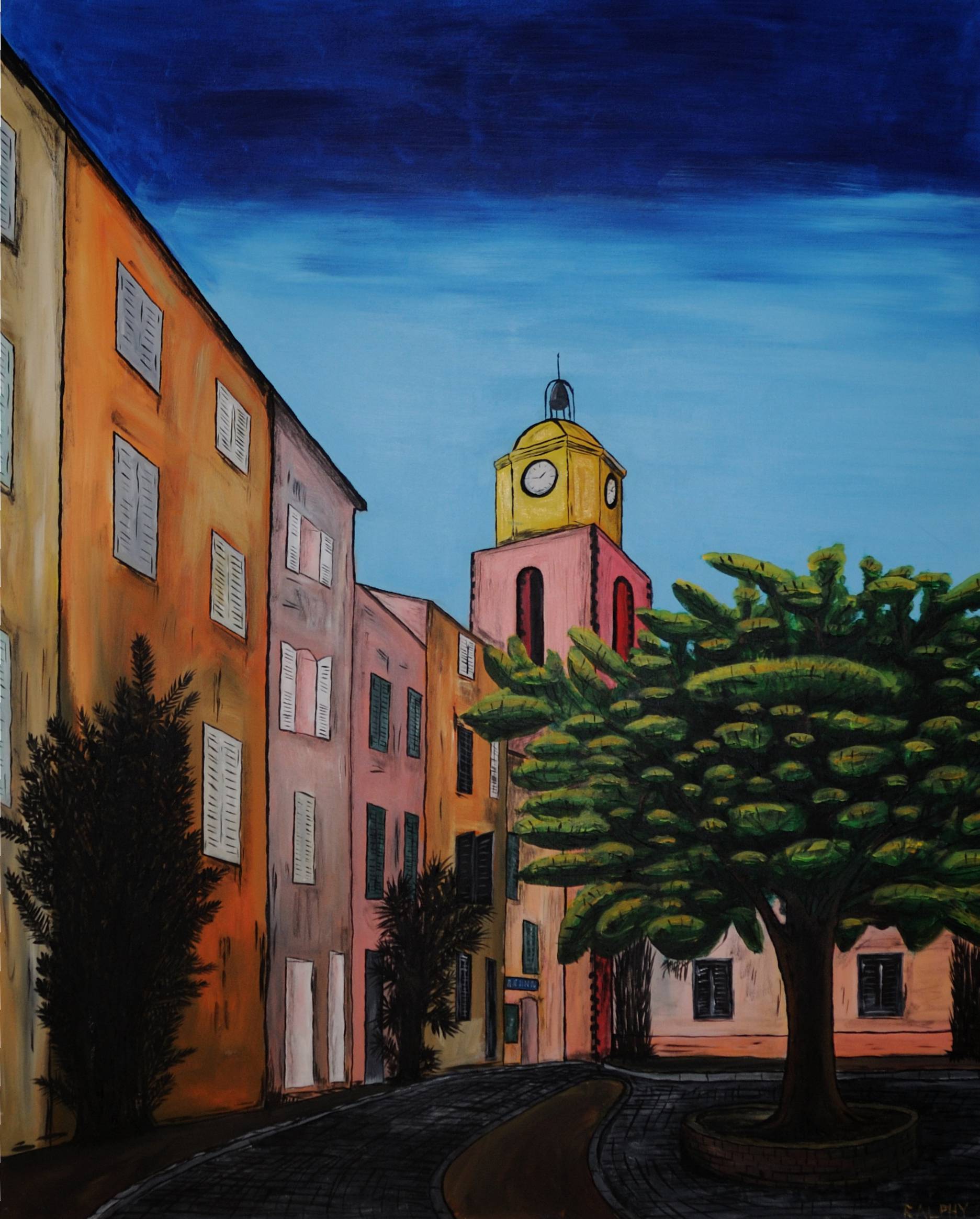 Na tym obrazie widzimy malownicze miasteczko skąpane w ciepłych barwach. Fasady budynków mienią się pastelami pomarańczy i różu. Ich okiennice, białe i szare, zdają się zamykać w sobie tajemnice mieszkańców. Nad tym wszystkim góruje wieża zegarowa, malowana intensywnym żółtym, przez co przyciąga wzrok jak magnes. Drzewo na pierwszym planie kusi intensywną zielenią, której gałęzie rozpościerają się na tle błękitnego nieba. Ach, te kolory! Obraz emanuje spokojem, jakby zatrzymał czas. To jakbyś patrzył na idylliczne miejsce, gdzie życie płynie niespiesznie. Mieszkańcy, choć ich nie widać, na pewno są leniwi i szczęśliwi. Styl? Trochę surrealizmu, trochę impresjonizmu. Technika artystyczna – zapewne olej na płótnie, z wyraźnymi pociągnięciami pędzla, które dodają dziełu dynamiki i głębi. Patrząc, czuję spokój i ciepło – dokładnie jak w those cozy, lazy afternoons. Obraz może wywołać nostalgiczne wspomnienia – latem spędzonym na południu Francji, a może cichą tęsknotę za spokojnym życiem z dala od zgiełku. Dziecko pewnie powiedziałoby: "Drzewo jest takie duże i zielone, jak brokuł!". Osobiście pragnę zanurzyć się w tę sielską codzienność, usiąść pod tym drzewem i patrzeć na niebo przez liście. Obraz czaruje swą prostotą, ale jednocześnie skłania do refleksji, łącząc zwyczajność z magią chwili.