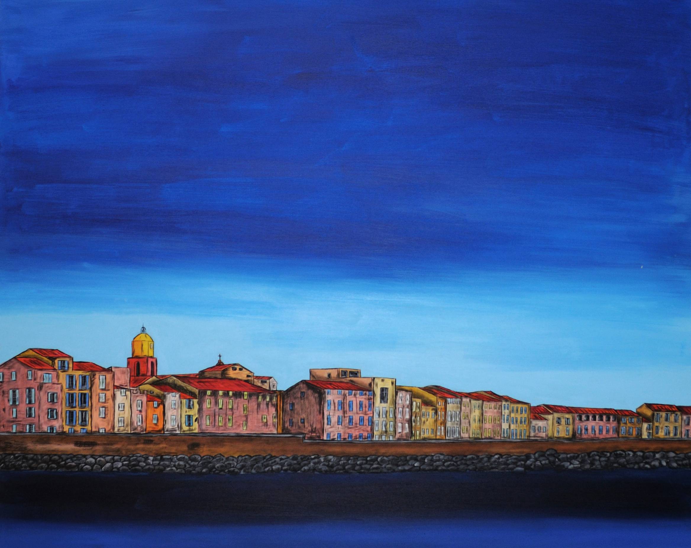 Na obrazie widać malowniczy widok miasteczka. Delikatne pastelowe kolory budynków kontrastują z nasyconym, głębokim błękitem nieba. Kolorystyka przywołuje uczucie spokoju, jakby czas zwolnił bieg, a my mogliśmy zatrzymać się na chwilę. Linie budynków są precyzyjnie rysowane, tworząc harmonijną kompozycję, która prowadzi wzrok od jednego końca do drugiego. Atmosfera wydaje się cicha i sielankowa, a może nawet trochę nostalgiczna. Artysta zastosował technikę mieszania barw, zacierając granice między niebem a ziemią. Technika przypomina impresjonistyczne podejście do światła i koloru. Z kolei budynki są przedstawione z większą dbałością o detal, co dodaje im realizmu. Czy te miejsca naprawdę istnieją? To trochę jak sen, który zamienia się w rzeczywistość. Dziecko powiedziałoby: "Te domy są tak kolorowe jak moje kredki!". Sprawia to, że zatrzymujemy się, by podziwiać każdy detal i kolor, które budzą w nas ciepłe emocje i prowadzą do refleksji o pięknie ukrytym w prostocie. To obraz, który można nazwać "captivating" — przyciąga uwagę i zatrzymuje na dłużej. Oglądając go, można poczuć, jak się zatracamy w tej spokojnej scenerii, odrywając od codziennego zgiełku.