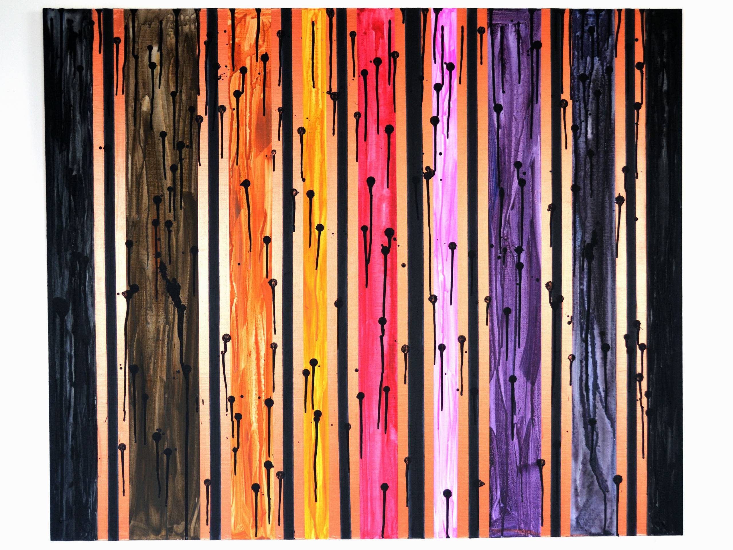 Obraz jest pełen żywych, pionowych pasów, które eksplodują kolorami. Czerń, pomarańcz, róż i fiolet tworzą intensywną kompozycję, w której każdy element łączy się z subtelnymi smugami i kroplami farby. To trochę jak bajkowy las, gdzie barwy przeplatają się w harmonicznym chaosie. Jest tu coś magicznego, coś, co przyciąga. Technika użyta przez artystę, zdaje się być mieszanką ekspresjonizmu i abstrakcjonizmu, gdzie intensywność barw współgra z dynamicznym ruchem farby. Całość emanuje nastrojem dynamiki i energii. Obraz może wywoływać u odbiorcy różnorodne emocje, od radości i ożywienia po refleksję nad chaosem i uporządkowaniem. To, jak z utworem muzycznym, gdzie każda nuta ma swoją rolę. Dziecko mogłoby powiedzieć: "Te kolory wyglądają jak tęcza po deszczu!" Patrząc na to dzieło, można poczuć się jak w środku burzy szalonego tańca kolorów. Jest coś urzekającego w tej spontaniczności, ten twist in the air. Akwarelowe smugi dodatkowo dodają mu lekkości, sprawiając, że czujemy się jak obserwatorzy magicznego świata pełnego barw.