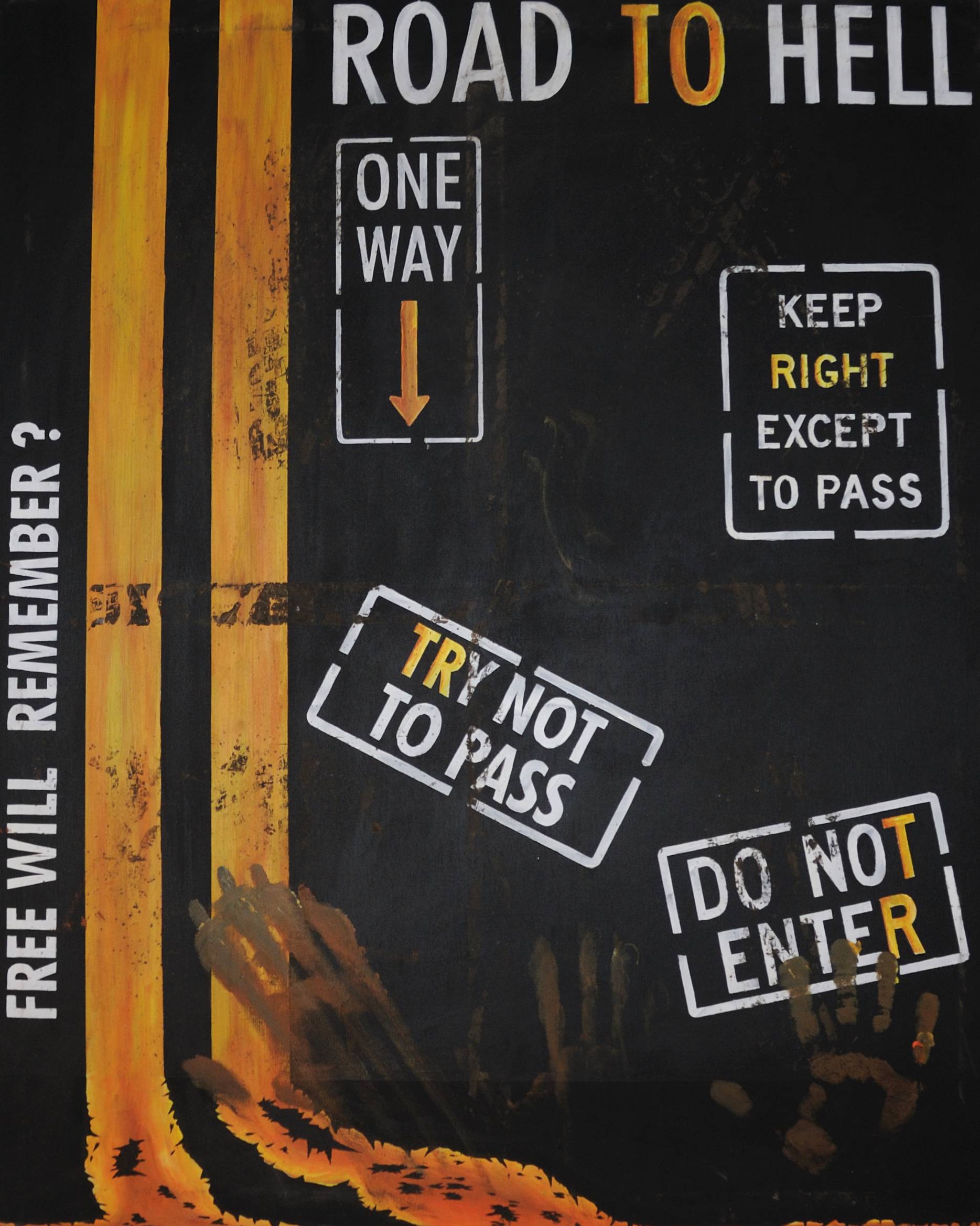 Ciemne tło obrazu kontrastuje z jaskrawymi żółtymi i pomarańczowymi pasami, tworząc dynamikę i napięcie. Wygląda jak pasy na drodze, prowadząc wzrok ku napisom „ROAD TO HELL”. Znaki drogowe, jak „ONE WAY” czy „KEEP RIGHT EXCEPT TO PASS”, są wykonane w białym, wyrazistym stylu. Tworzą atmosferę ograniczeń, niczym krzyczące ostrzeżenia. Artysta wykorzystał technikę mieszania intensywnych barw z ciemnym tłem, co wzmacnia poczucie niepokoju i zaszczucia. Emocje? Można odczuć chaos, jakby droga faktycznie prowadziła do piekła. Stylistycznie przypomina trochę street art, z surowym, buntowniczym podejściem. Wielkie pomarańczowe dłonie na dole dodają dramy. Jakby ktoś próbował się bronić przed nieuniknionym losem. „Free will, remember?” pozostawia refleksję nad wolnością wyboru. Jak my to w ogóle mamy ogarnąć? Wszystko zamknięte w jednym wielkim „Restricted Area”. Taki rollercoaster myśli wciąga, przeraża, a jednocześnie skłania do refleksji. Pełna kontrastów opowieść o życiu i decyzjach. "Don't you wanna change the path?" Totalnie daje do myślenia.