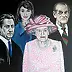 Na obrazie widzimy czworo znanych postaci, które stoją na ciemnym tle. Dominują kolory pastelowe, szczególnie róż i błękit. Każda z osób jest umieszczona w świadomym ułożeniu, tworząc zbalansowaną kompozycję. Pierwsza postać, w różowym stroju i kapeluszu, emanuje spokojem i godnością. Druga osoba, ubrana w klasyczne ciemne ubranie, dodaje do obrazu formalności. Trzecia postać ma na sobie elegancki niebieski strój, wprowadzając do obrazu nutę nowoczesności. Ostatnia osoba w krawacie w pasy dopełnia całość klasycznym stylem. Atmosfera obrazu jest formalna, ale z lekkim twistem nowoczesności. Artysta wykorzystuje techniki malarskie przypominające styl portretowy, stawiając akcent na detalach twarzy postaci. Na obrazie jest coś ujmującego, czego nawet nie da się tak łatwo opisać słowami. To taki feeling, jakby ktoś oglądał ważne wydarzenie z historycznym zacięciem. Dla dziecka to może wyglądać jak bajka z eleganckimi królowymi i królami, które spotkały się na magicznym balu. Ha, trochę tak jak w tych kreskówkach! Obraz ten może wywoływać poczucie szacunku czy nostalgii. Dla niektórych, może to być glimpse into the past, przypomnienie o starych czasach. Osobiście, czuję małe ukłucie ciekawości. Kto wie, co by się stało, gdyby ci wszyscy ludzie rzeczywiście się spotkali?