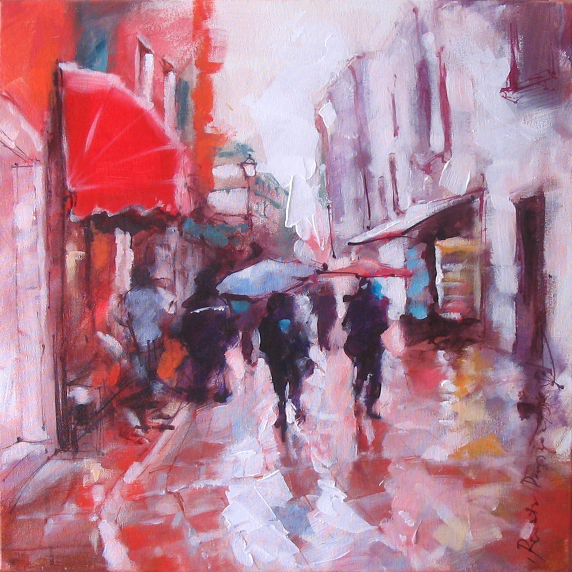 Obraz przedstawia zatłoczoną uliczkę w deszczowy dzień, subtelnie rozmytą przez deszczowe krople. Dominują ciepłe odcienie czerwieni i różu, które kontrastują z chłodnymi szarościami i błękitem. Czuć tu energię miasta, jego nieprzerwaną pulsację. Niby wszystko płynie swoim rytmem, a jednak każdy krok malowanym rozmazanym pędzlem przypomina o ulotności chwili. Ta kompozycja zachwyca przypadkową harmonią, zbudowaną z prostych kształtów. Ulica odbija się w mokrym bruku, tworząc miękką mgłę barw. To jakby snapshot frozen in time. Technika impresjonistyczna, pełna lekkich, szybkich pociągnięć, buduje ten niepowtarzalny klimat. Niegdyś deszcz mnie irytował, a teraz, patrząc na ten obraz, odczuwam wręcz odwrotne – spokój i melancholię. Daje poczucie zatopienia w teraźniejszości. "Deszcz fajny!" powiedziałoby dziecko, zadowolone z błotnych kałuż. Obraz budzi refleksję nad małymi radościami codzienności. Czy nie warto po prostu czasem zatrzymać się i docenić te małe momenty?