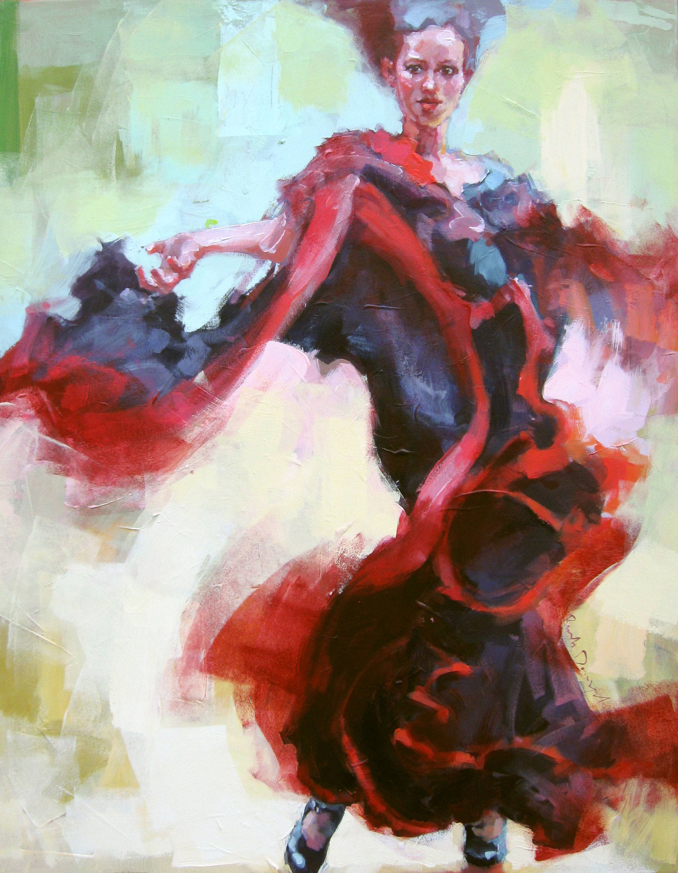 Obraz emanuje energią i ruchem, pokazując kobietę w roztańczonej pozie. Dominują na nim odcienie czerwieni, czerni i delikatne plamy zieleni, które nadają mu dynamicznego wyrazu. Suknia tancerki jest jak płomień, falująca i rozmyta, co dodaje całości ulotności i delikatności. Atmosfera jest pełna pasji, jakbyśmy byli świadkami chwili pełnej emocji. Tancerka wydaje się być pochłonięta w tańcu, jej twarz skupiona, a ruchy pełne gracji. To moment zawieszenia w czasie, gdzie wszystko inne przestaje mieć znaczenie. Wyczuwalna jest tu intensywność, może nawet odrobina dramatyzmu. Styl artystyczny przypomina impresjonizm z odważnym użyciem pędzla i szybkimi, zamaszystymi ruchami. Kolory i formy są niedopowiedziane, co daje przestrzeń dla wyobraźni widza. To, co widać, to nie szczegóły, ale esencja ruchu i emocji. Wow, jaka piękna sukienka! Słowa same cisną się na usta. Ten obraz wywołuje dreszcze ekscytacji. Można wręcz poczuć muzykę, która towarzyszy tańcowi. Jest coś magicznego w tej dynamice; przypomina o ulotności chwili i pięknie ruchu. W takiej chwili, "freedom" zyskuje nowy wymiar, pokazując, jak sztuka potrafi uchwycić to, co nieuchwytne.