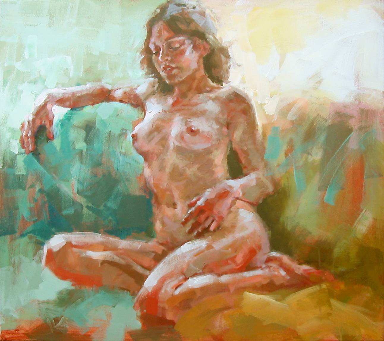 Obraz emanuje ciepłem i spokojem, a jego paleta kolorów to miękkie pastele: odcienie zieleni, beżu i łagodnego różu. Postać centralna usytuowana jest w relaksującej pozie, co daje wrażenie zamyślenia lub kontemplacji. Kształty są miękkie i lekko rozmyte, co nadaje całej kompozycji niezwykłej delikatności. Atmosfera obrazu przypomina szept w letni poranek. Jest jakby zamrożoną chwilą ciszy. Ta scena może wzbudzać w odbiorcy uczucie spokoju i introspekcji. Styl obrazu przypomina impresjonizm z nutą ekspresjonizmu. Artysta zastosował szybkie, pewne pociągnięcia pędzla, które tworzą dynamiczne, niemalże chaotyczne tło. Wydaje się, że technika ta pozwala na uchwycenie ulotnego momentu. Dzieło oddaje emocje poprzez teksturę i barwę, zamiast skupiać się na detalu. To jednocześnie lekkość i pewność kreski, co dodaje mu uroku. Patrząc na obraz, można poczuć nutę melancholii, ale także coś w rodzaju nadziei. Jakby ta postać była tuż na granicy odkrycia czegoś ważnego. Może przemyślań. A może to tylko cisza przed nadchodzącą burzą emocji. Jest tu też coś „mysterious”, nieuchwytnego. Jak mówi siedmioletnie dziecko, to pani wygląda spokojnie, jak babcia, kiedy pije herbatę. Obraz zmusza do zastanowienia, co za myśli kłębią się w głowie modelki. Głęboka, osobista refleksja, którą każdy z nas może odczytać na swój sposób, wciąga i intryguje.